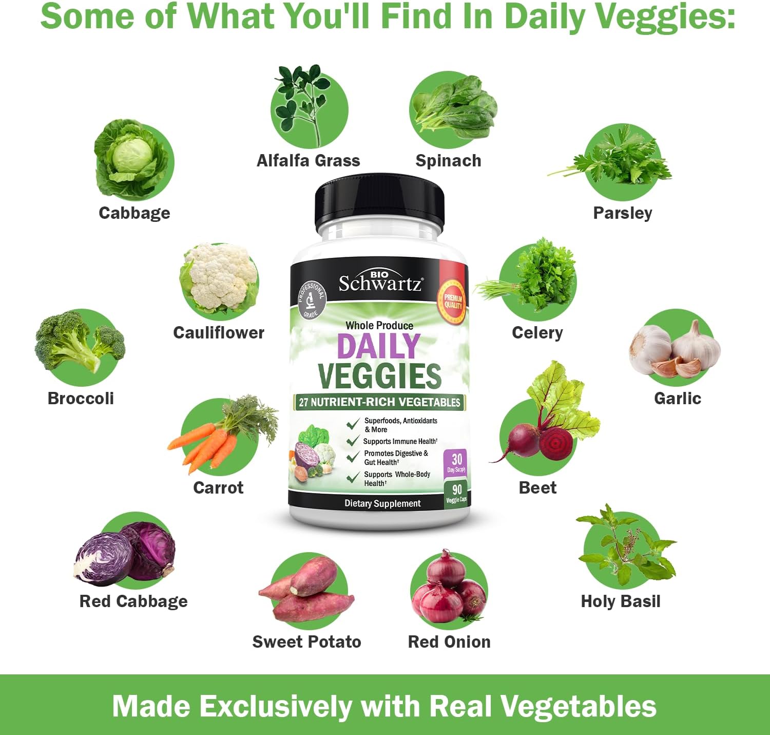About this item 47 Whole Food Fruits and Vegetables: Our fruit and veggies supplement features a wide range of antioxidant and nutrient dense whole foods including superstar ingredients like Acai and Brussels sprouts Accessible Wellness: We know how hard it can be to get your daily dose of healthy produce which is why we developed our super greens veggie and fruit supplements with vegan and non-GMO ingredients Complete Support: Fruit and veggie vitamins for adults provide much needed antioxidants with naturally occurring vitamins and minerals that your body needs to look and feel your best year round Trusted Quality: Our gentle fruit and veggie pills are carefully manufactured right here in the US and 3rd party tested with the strictest cGMP guidelines to be GMO and gluten free Setting a Higher Standard: At BioSchwartz we are proud to be a trusted name in a variety of health and wellness categories - Visit the BioSchwartz Store to see our range of premium dietary supplements › See more product details,47 Whole Food Fruits and Vegetables: Our fruit and veggies supplement features a wide range of antioxidant and nutrient dense whole foods including superstar ingredients like Acai and Brussels sprouts,Accessible Wellness: We know how hard it can be to get your daily dose of healthy produce which is why we developed our super greens veggie and fruit supplements with vegan and non-GMO ingredients,Complete Support: Fruit and veggie vitamins for adults provide much needed antioxidants with naturally occurring vitamins and minerals that your body needs to look and feel your best year round,Trusted Quality: Our gentle fruit and veggie pills are carefully manufactured right here in the US and 3rd party tested with the strictest cGMP guidelines to be GMO and gluten free,Setting a Higher Standard: At BioSchwartz we are proud to be a trusted name in a variety of health and wellness categories - Visit the BioSchwartz Store to see our range of premium dietary supplements