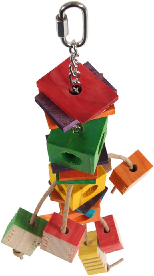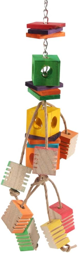 A groovy toy your Parrot can enjoy foraging and chewing in. This Dancing Foraging Cubes Parrot Toy lets your Parrot enjoy chewing and foraging fun. Wedge pieces of favoured food, tasty treats, or your Parrotâ€s most desired materials into the grooves and holes in the wood blocks, then place this Dancing Foraging Cubes Parrot Toy up in your feathered friendâ€s cage or on their play gym stand using the metal quick link provided. Having to work food out of these blocks offers essential mental stimulation for your Parrot, as well as providing them with a more natural way of feeding; locating food, then having to find a way to get it out, is how your bird would naturally feed. Each of the blocks on this Foraging Cubes freely move on the metal chain or paper rope, so as your Parrot attempts to retrieve their rewards the blocks twist, making it that little bit more difficult then it may first appear. Plus, these coloured wood blocks provide plenty of material for your Parrot to chew; helping to keep their beak nice and trim along the way. Your Parrot can also enjoy chewing and shredding on the paper rope, as well as having fun untying the knots; occupying your Parrot's clever mind. Dimensions Length 48cm (19") Width 15cm (6") Materials Wood, Paper, Metal - African Grey Parrots - Amazon Parrots - Caiques - Eclectus Parrots - Large Conures - Meyer's and Senegal Parrots - Quakers also known as the Monk Parakeet - Small Conures - Small Macaws or Mini Macaws Please remember this information is for size guidance only - you know your bird best!