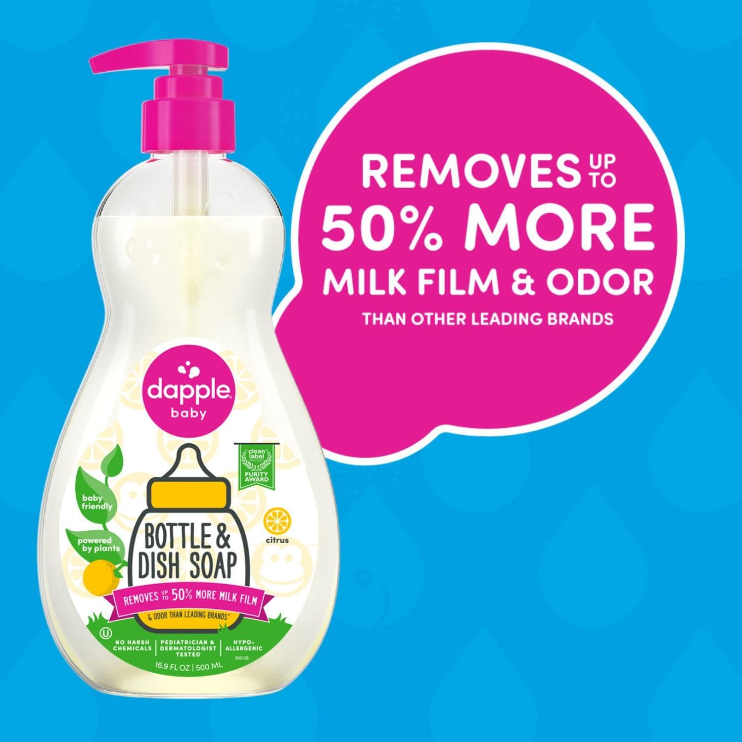 MULTI-USE AND SPECIALLY FORMULATED TO CLEAN RESIDUE FROM MILK AND FORMULA: Dapple Baby Bottle & Dish Soap is specifically formulated to clean fat, protein and carbohydrate residue, which is commonly found in baby bottles with milk and formula film, and more broadly when cleaning the full family’s dishes10RINSES CLEAN AND OFFERS POWERFUL PLANT-BASED CLEANING: Proven to remove up to 50% more milk film and odor than other brands* and rinses clean so no residue remains on baby and children’s items. Effectively cleans bottles, sippy cups, pacifiers, breast pump components and your full family’s dishes10MINDFUL INGREDIENTS: Dapple Baby Bottle & Dish Soap is a Clean Label Project Purity Award Winner for clean and pure ingredients, is pediatrician and dermatologist tested, hypoallergenic, made with plant-based ingredients and without harsh chemicals, parabens, sulfates, phthalates, mineral oil, synthetic dyes & fragrances, chlorine, alcohol, SLS, SLES, MEA, DEA, TEA10UNSCENTED & SCENTED VERSIONS: Available in fragrance free, lavender, mango melon, citrus, and apple pear fragrances10CONVENIENT PUMP TOP: Comes with a convenient pump top dispenser for clean and easy use. Caps and pumps may vary temporarily due to supply chain constraints