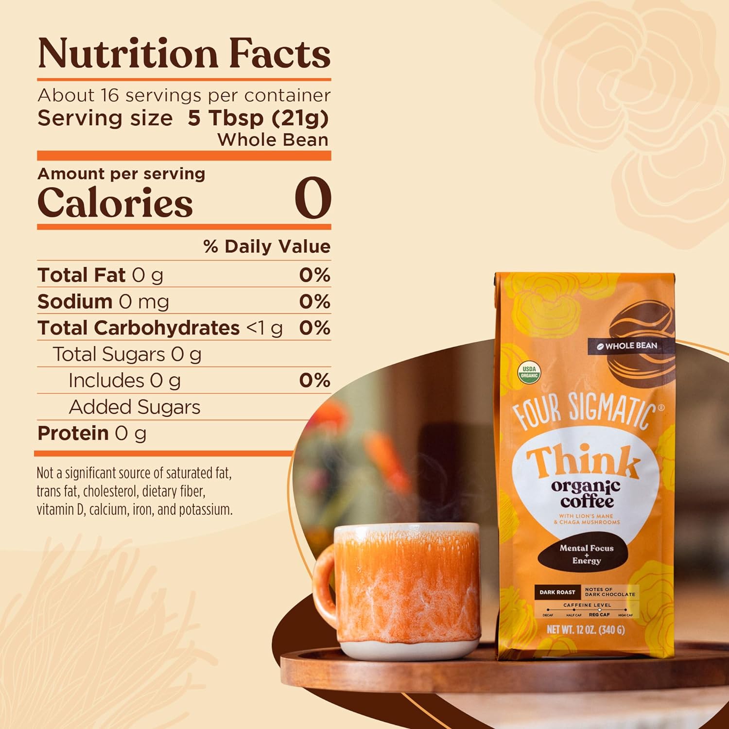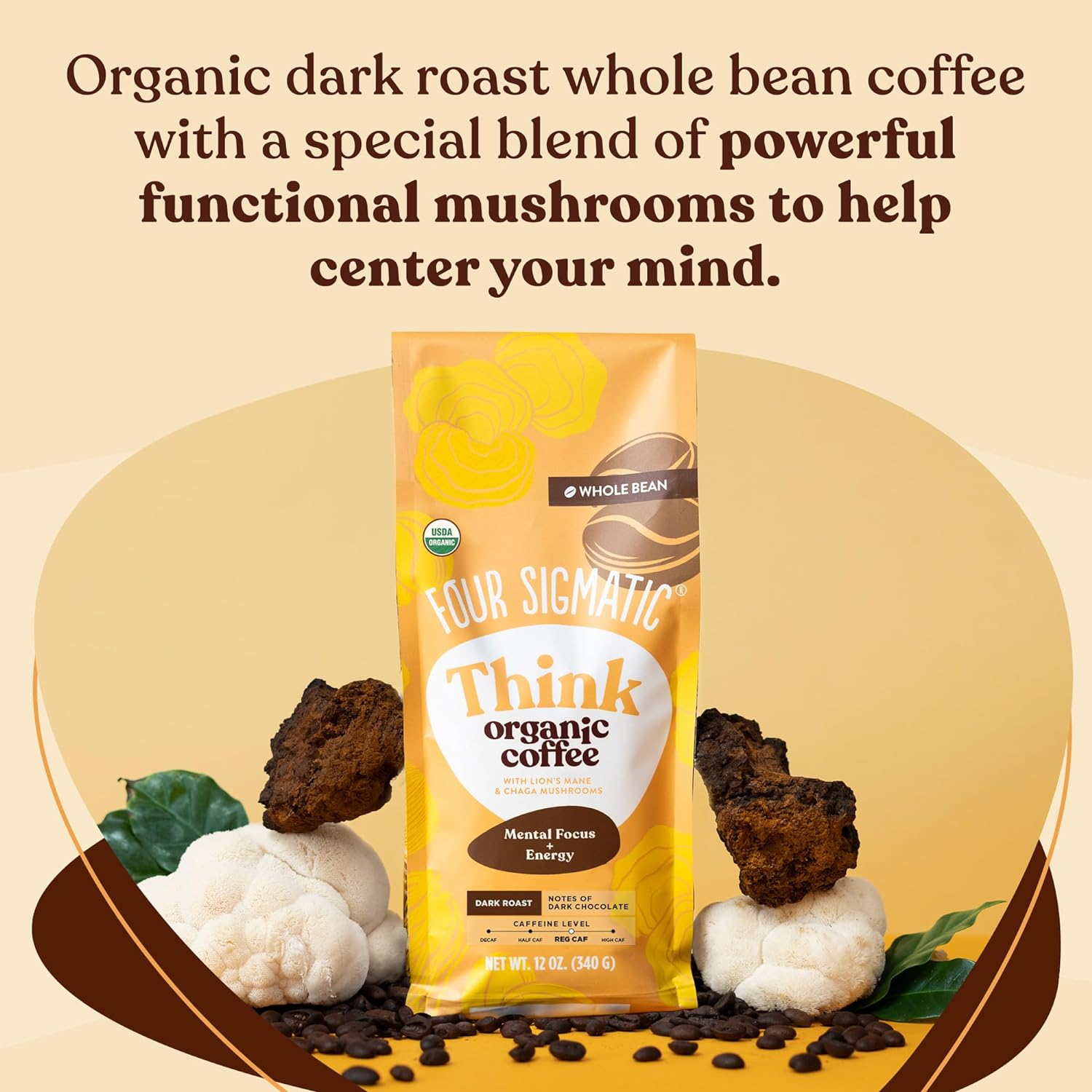 Dark Roast Organic Whole Bean Coffee By Four Sigmatic | Fair Trade Coffee Beans Coated With Lion'S Mane, Chaga Mushrooms | Nootropic Mushroom Coffee For Enhanced Brain Function & Immune Support | 12Oz