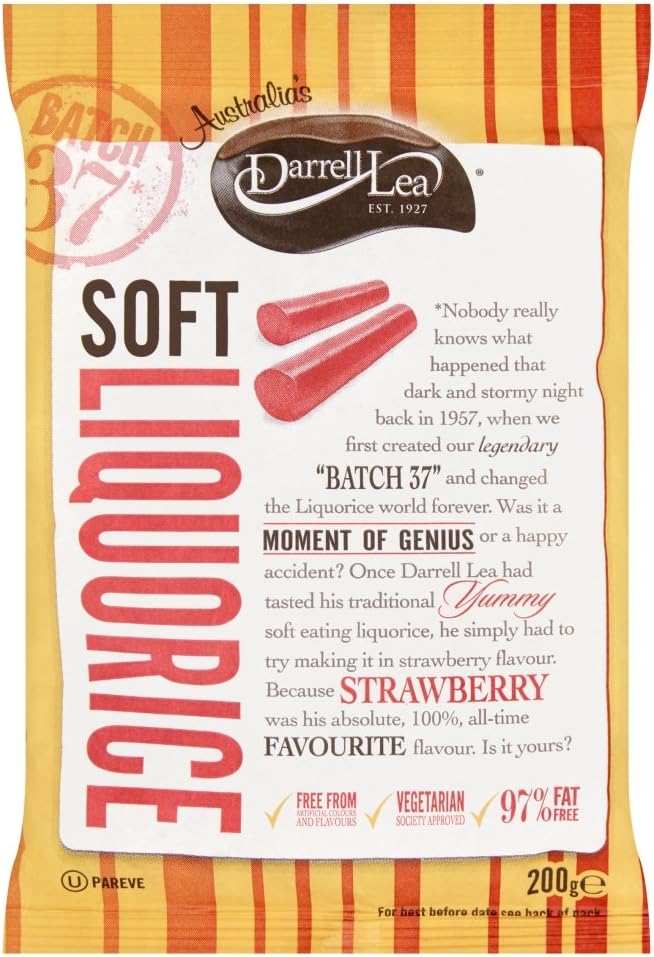 Product Description 8 x 200 g darrell lea batch 37 strawberry liquorice. Ingredients Glucose Syrup ( from Wheat), Wheat flour, Sugar, Water, Palm Oil, Natural Falvouring , Mallic Acid, Citric Acid, Salt, Colour, Liquorice Extract P.when('A').execute(function(A) { A.on('a:expander:toggle_description:toggle:collapse', function(data) { window.scroll(0, data.expander.$expander[0].offsetTop-100); }); }); Directions Remove from packaging and eat Manufacturer Contact Information May & Raeburn Raeburn House 98 High Street Ingatestone Essex CM4 0BA UNITED KINGDOM See more,Delicious tasting strawberry flavoured liquorice,Ideal gift,Ideal for many occasions