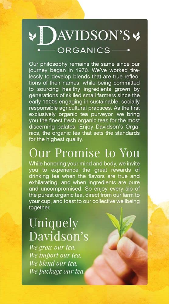 Trust Our Tea: Davidson'S Organics Was The First Purveyor Of Fine Organic Teas. Since 1976, WeāVe Worked Tirelessly To Develop Blends That Are True Reflections Of Their Names, While Being Committed To Sourcing Healthy Ingredients Grown By Generations Of Skilled Small Farmers. Enjoy Davidson'S Organics, The Organic Tea That Sets The Standards For The Highest Quality