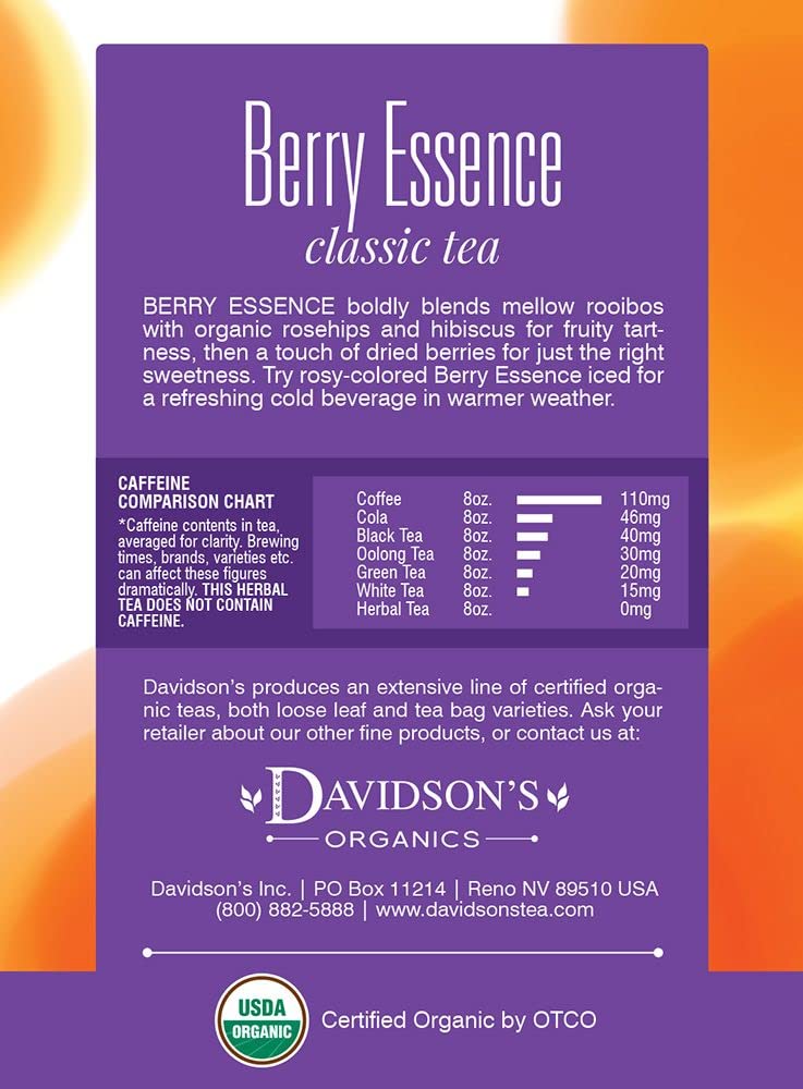 Berry Essence Combines Blueberry, Raspberry And Blackberry Essences With A Floral Base Of Rosehips, Chamomile, Hibiscus And South African Rooibos. Davidson'S Berry Essence Is A Fruity Blend With Sweet, Earthy Undertones And A Floral Finish