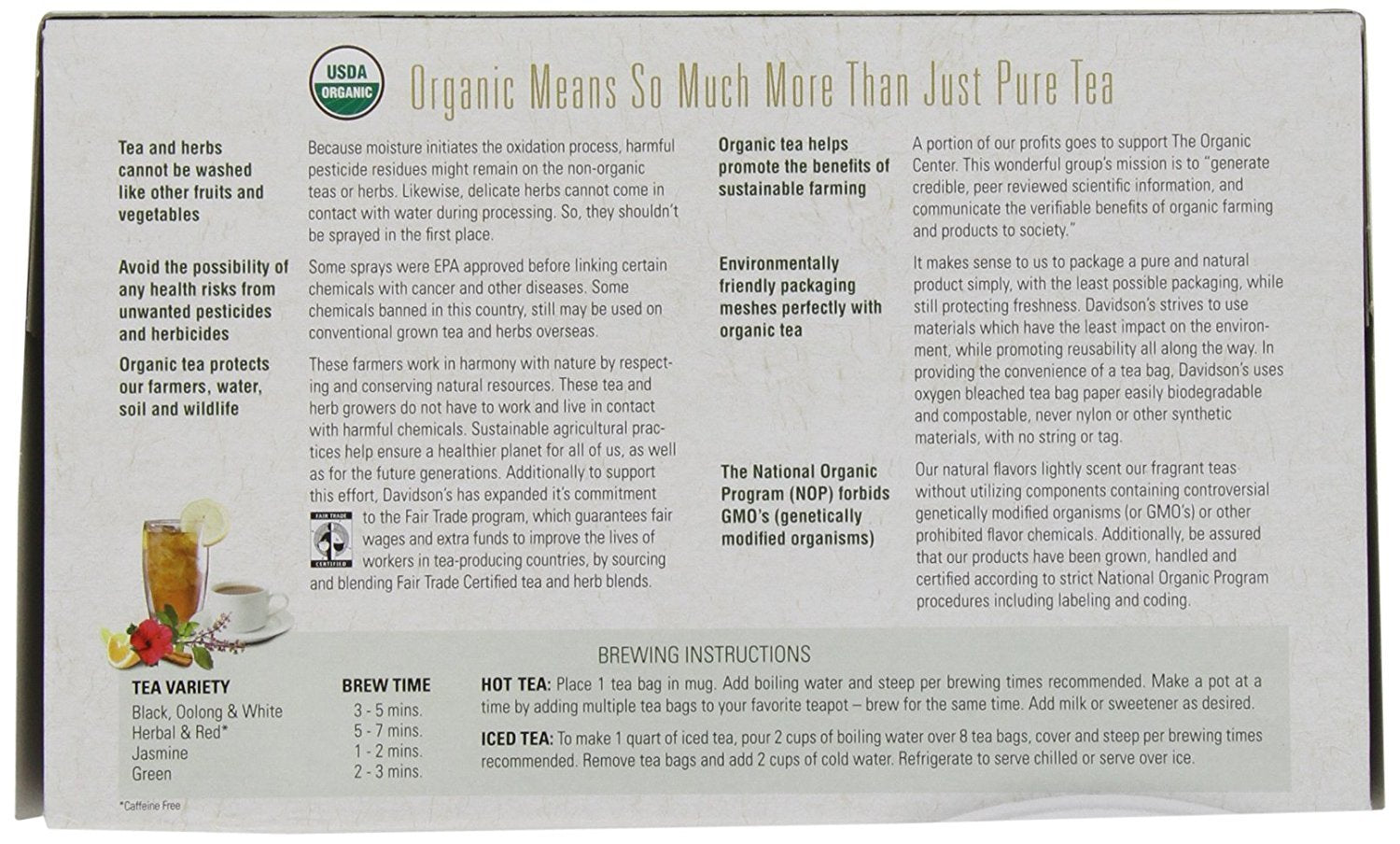 Trust Our Tea: Davidson'S Organics Was The First Purveyor Of Fine Organic Teas. Since 1976, WeāVe Worked Tirelessly To Develop Blends That Are True Reflections Of Their Names, While Being Committed To Sourcing Healthy Ingredients Grown By Generations Of Skilled Small Farmers. Enjoy Davidson'S Organics, The Organic Tea That Sets The Standards For The Highest Quality