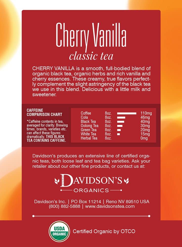 Cherry Vanilla Combines Organic Herbs With Creamy Vanilla To Create A Full-Bodied Black Tea Brew With A Touch Of Cherry Sweetness On Top. Davidson'S Cherry Vanilla Carries A Rich And Fruity Flavor Profile, Balanced By Our Robust Organic Black Tea