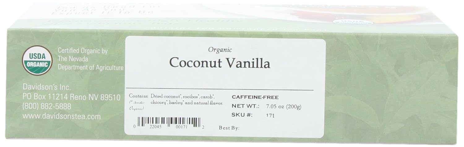 Coconut Vanilla Combines Vanilla Essence And Coconut Flakes With A Base Of Creamy Chicory, Barley And South African Rooibos, Making The Blend A Perfect Caffeine-Free Dessert Alternative With Only 3 Calories Per Cup. Davidson'S Coconut Vanilla Is A Rich, Buttery Herbal Blend With Coconut Top Notes And Vanilla Undertones
