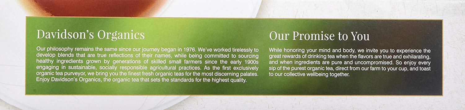 Trust Our Tea: Davidson'S Organics Was The First Purveyor Of Fine Organic Teas. Since 1976, We’Ve Worked Tirelessly To Develop Blends That Are True Reflections Of Their Names, While Being Committed To Sourcing Healthy Ingredients Grown By Generations Of Skilled Small Farmers. Enjoy Davidson'S Organics, The Organic Tea That Sets The Standards For The Highest Quality