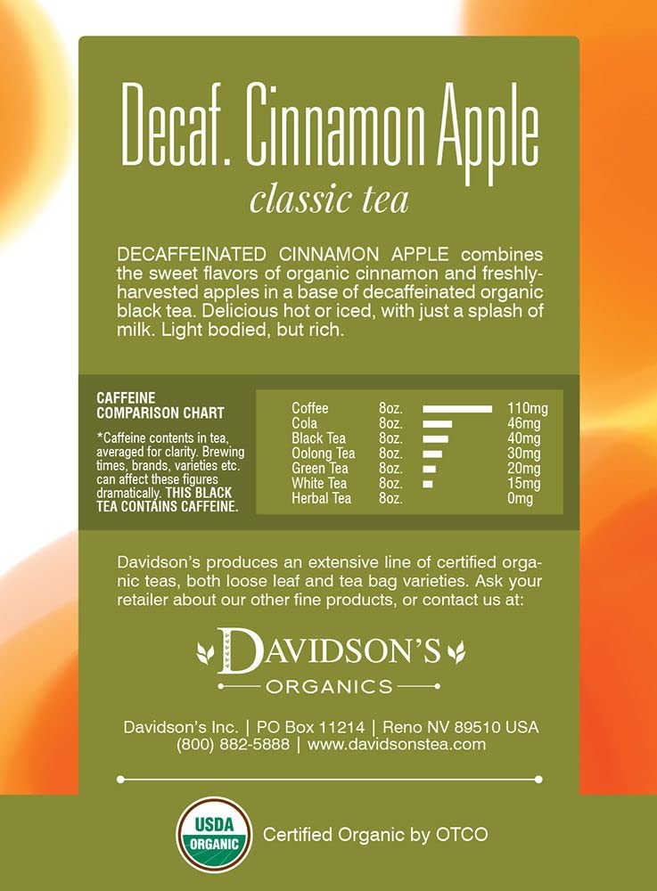 Decaffeinated Cinnamon Apple Combines Crisp Apple Essence And Aromatic Spices With A Robust Base Of Decaffeinated Black Tea. Davidson'S Decaffeinated Cinnamon Apple Is A Full-Bodied, Spicy Black Tea Brew, As Rich As Its Caffeinated Counterpart