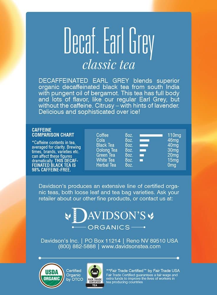 Decaffeinated Earl Grey combines robust decaffeinated black tea with natural oil of bergamot to create a brew that is both deeply layered and delightfully citrusy. As one of Davidsonās best-selling decaffeinated blends, Decaffeinated Earl Grey is prided for its citrus undertones and floral top notes, a black tea blend as rich as its caffeinated counterpart