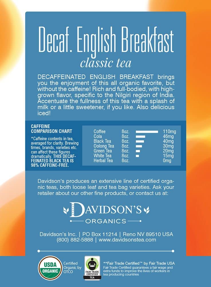 Decaffeinated English Breakfast Offers A Base Of Robust Decaffeinated Black Tea. Davidson'S Decaffeinated English Breakfast Is A Full-Bodied Black Tea Brew With A Malty Finish, As Rich As Its Caffeinated Counterpart