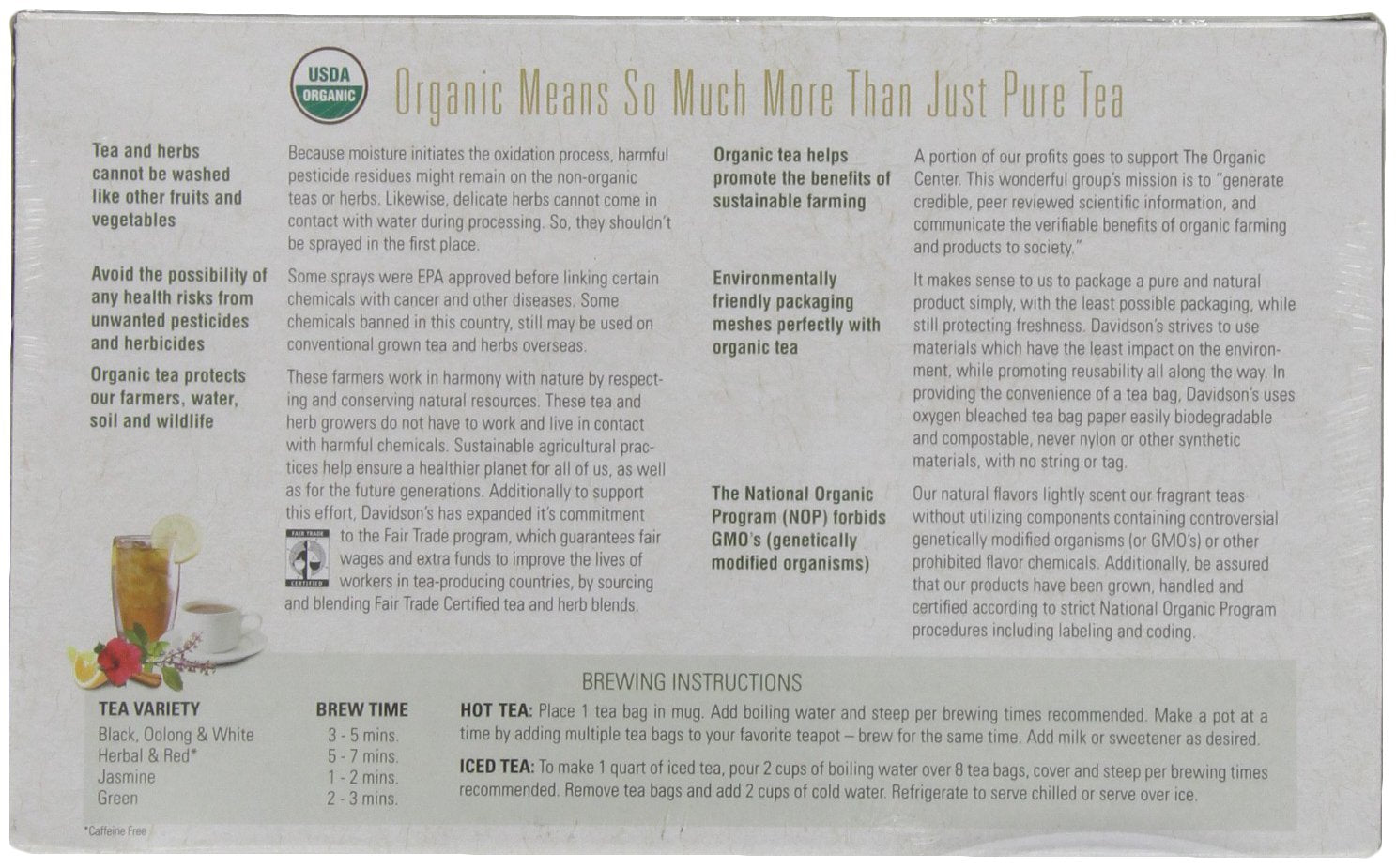 TRUST OUR TEA: Davidson's Organics was the first purveyor of fine organic teas. Since 1976, weāve worked tirelessly to develop blends that are true reflections of their names, while being committed to sourcing healthy ingredients grown by generations of skilled small farmers. Enjoy Davidson's Organics, the organic tea that sets the standards for the highest quality