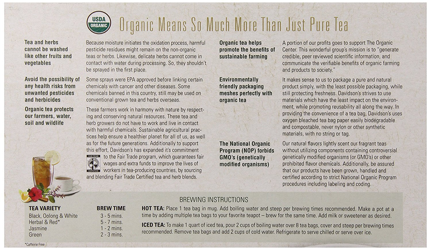 Trust Our Tea: Davidson'S Organics Was The First Purveyor Of Fine Organic Teas. Since 1976, WeâVe Worked Tirelessly To Develop Blends That Are True Reflections Of Their Names, While Being Committed To Sourcing Healthy Ingredients Grown By Generations Of Skilled Small Farmers. Enjoy Davidson'S Organics, The Organic Tea That Sets The Standards For The Highest Quality