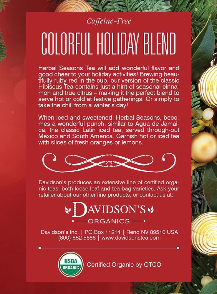 Herbal Seasons Combines Cinnamon And Citrus With A Base Of Hibiscus Flowers To Create A Festive, Ruby Red Brew. Davidson'S Herbal Seasons Is A Balanced Blend With A Tart, Floral Base And A Sweet, Spicy Finish