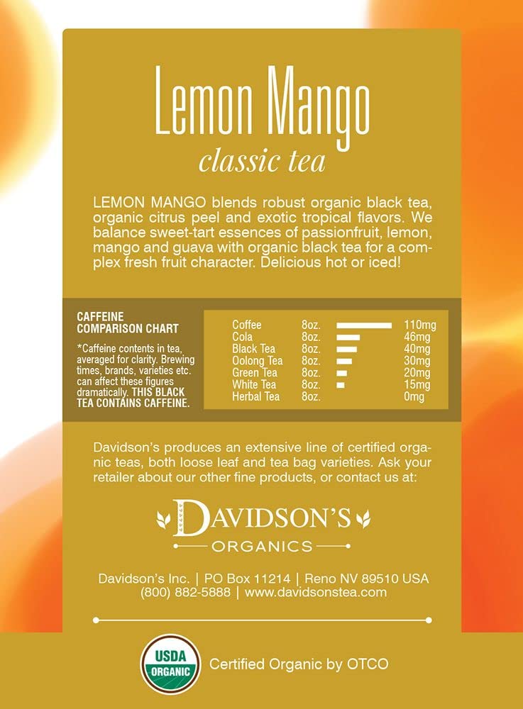 Lemon Mango Combines Organic Lemongrass With Exotic Natural Mango Essence. Davidson'S Lemon Mango Is A Full-Bodied Black Tea Brew With A Tart And Tropical Finish