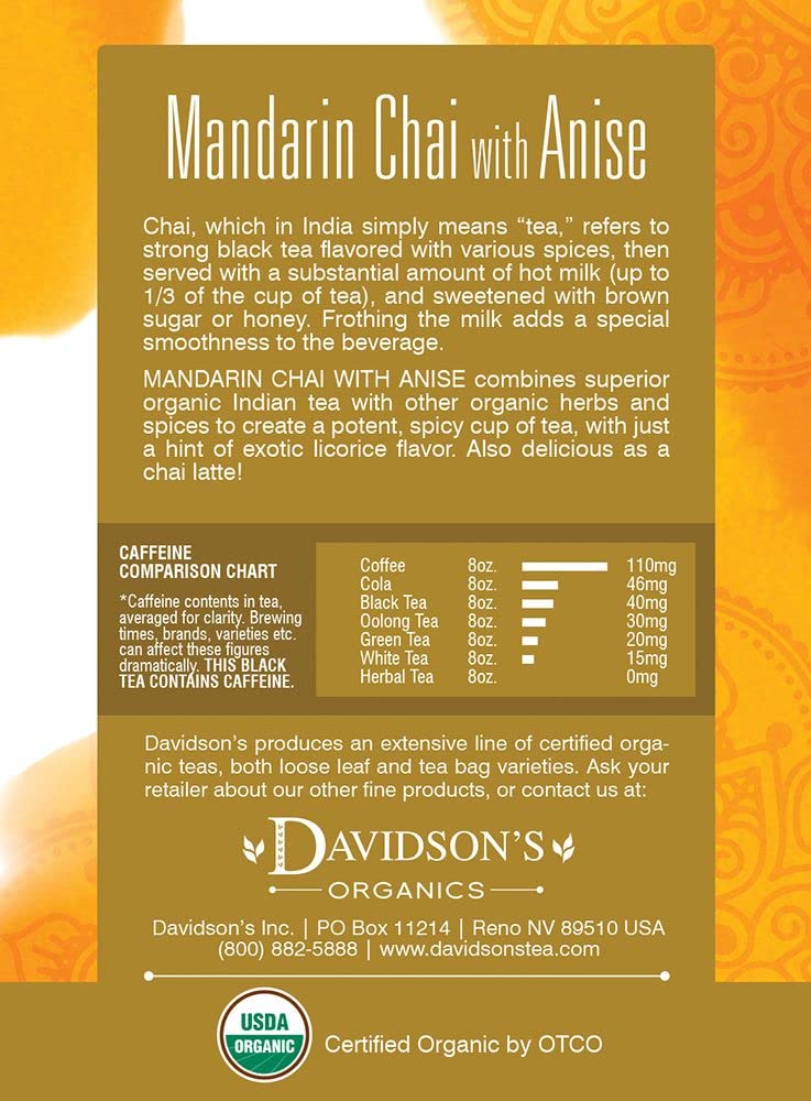 Mandarin Chai With Anise Combines Robust Herbs And Spices With A Full-Bodied Black Tea Base. Davidson'S Mandarin Chai With Anise Is A Sweet And Spicy Brew With Tropical Undertones And A Licorice-Like Finish