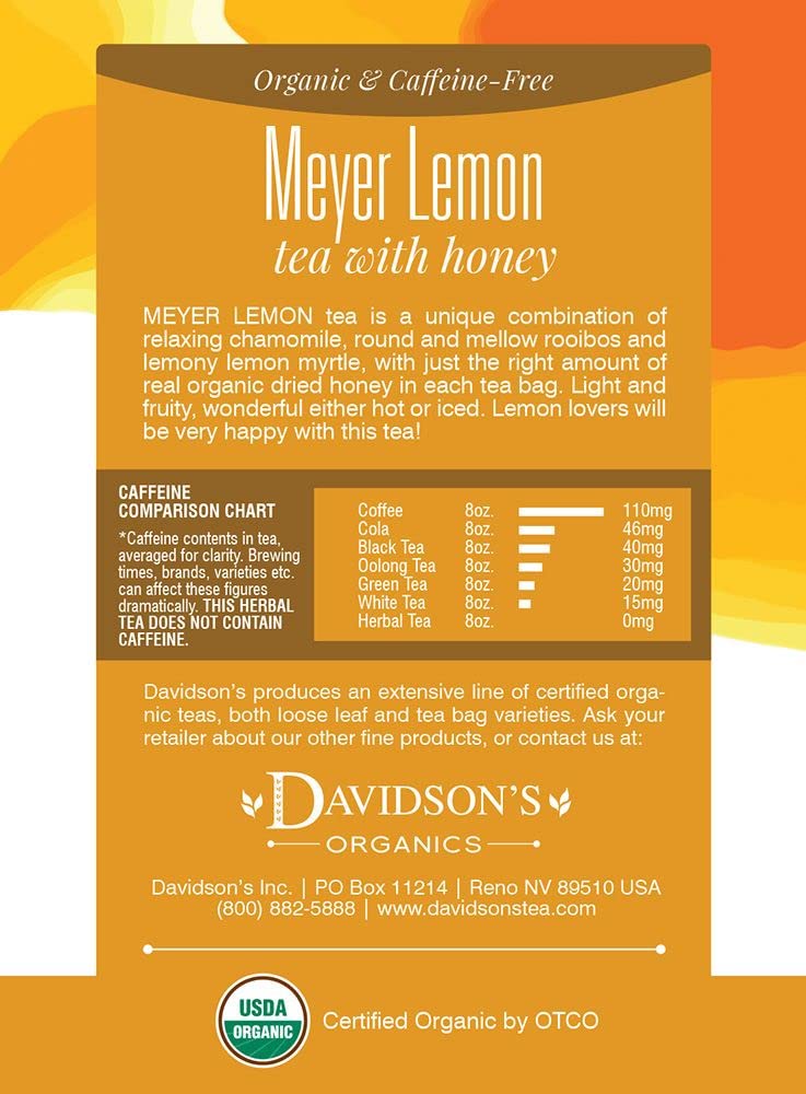 Meyer Lemon Combines Organic Dried Honey Crystals With Lemongrass And An All-Herbal Base Of Chamomile And South African Rooibos. Davidson'S Meyer Lemon Is A Sweet, Fruity Blend With A Lemon Finish