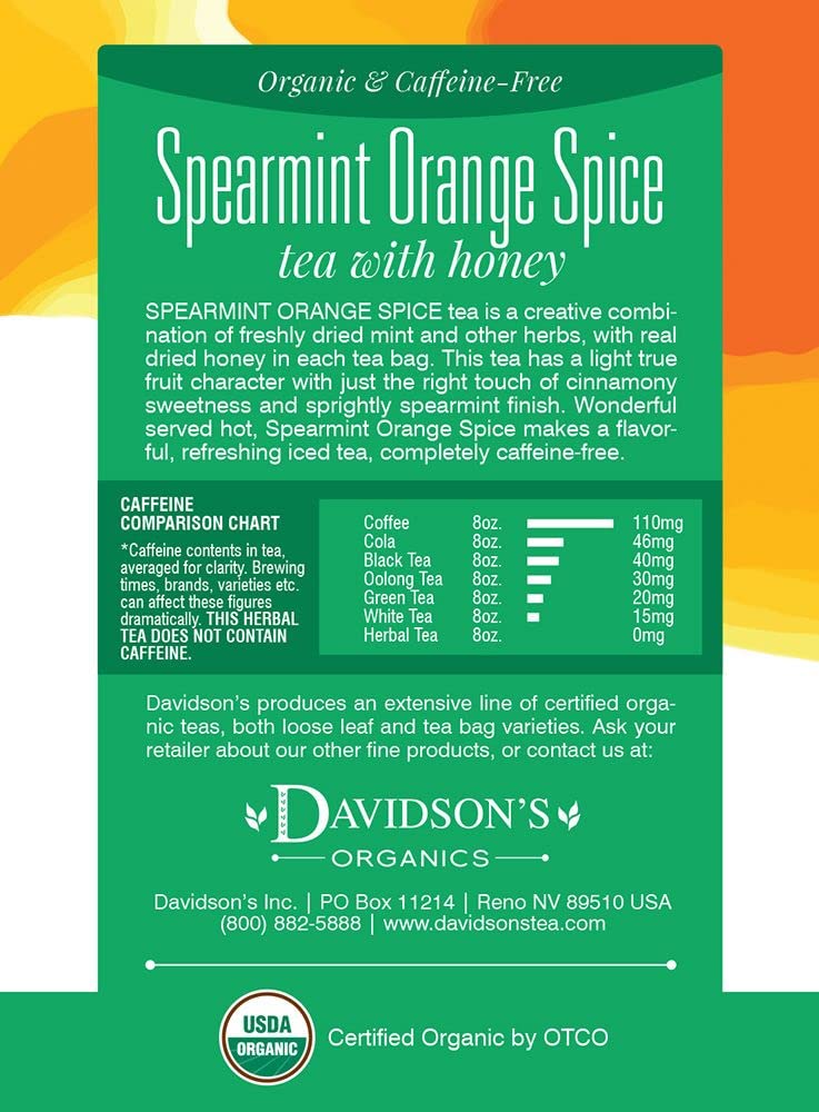 Spearmint Orange Spice Combines Organic Dried Honey Crystals, Spearmint And Orange Peel For A Herbal Brew. Davidson'S Spearmint Orange Spice Is A Sweet And Refreshing Blend Of Citrus And Cinnamon Spice