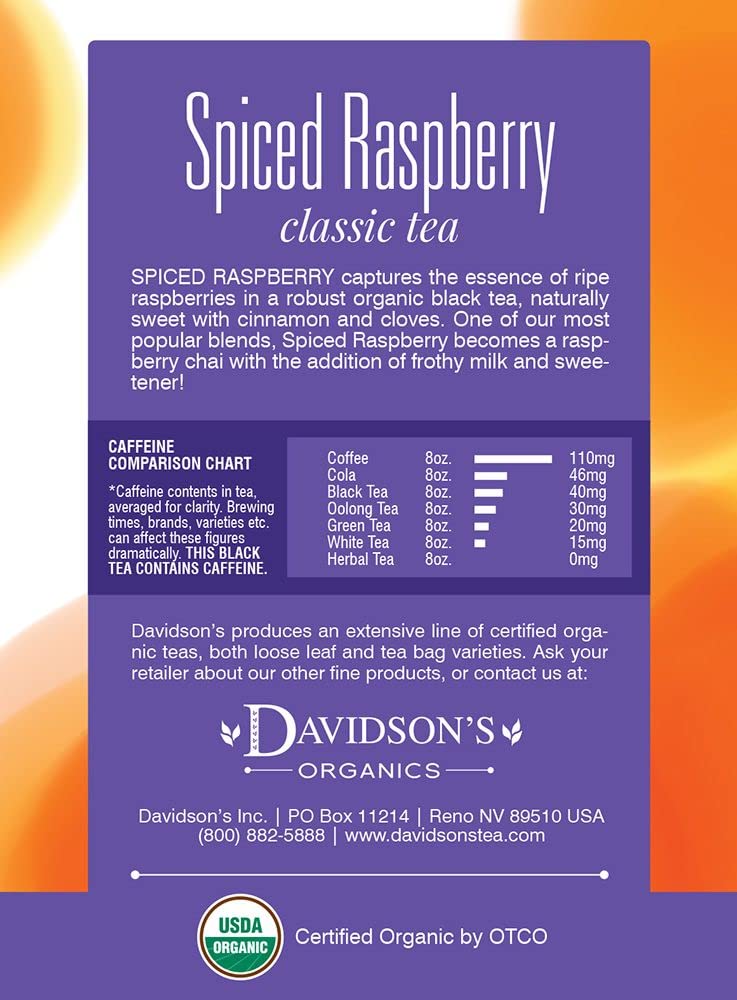 Spiced Raspberry combines the essence of ripe raspberries with aromatic spices and a base of organic black tea. Davidson's Spiced Raspberry is a full-bodied black tea brew with nuances of freshly-baked raspberry pie