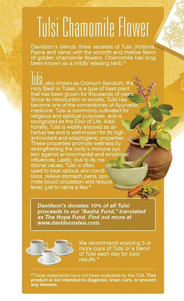 Tulsi Chamomile Flower Combines Golden Chamomile With Three Adaptogenic Varieties Of Tulsi (Krishna, Rama, And Vana). Davidson'S Tulsi Chamomile Flower Is A Mellow, Relaxing Herbal Brew With A Floral And Citrus Flavor Profile