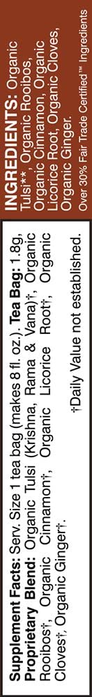 Tulsi Rooibos Chai blends three adaptogenic varieties of Tulsi (Krishna, Rama and Vana) with South African rooibos and aromatic spices. Davidson's Tulsi Rooibos Chai is a full-bodied, spicy brew with abundant antioxidant properties