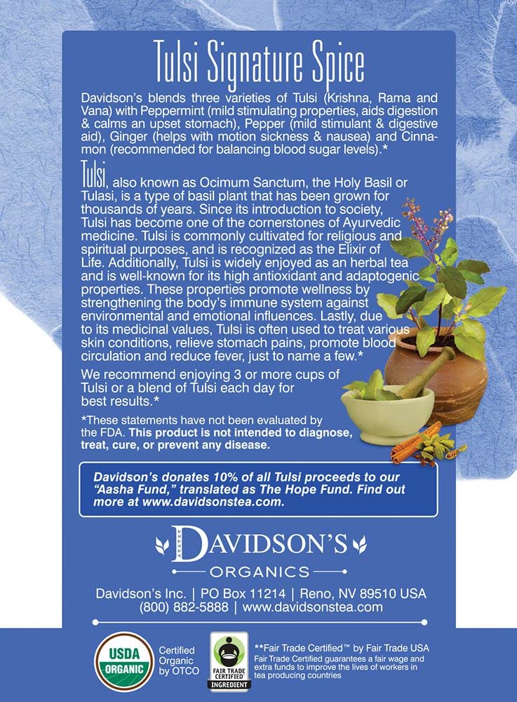 Tulsi Signature Spice Combines Mint, Citrus And Various Spices With Three Adaptogenic Varieties Of Tulsi (Krishna, Rama, And Vana). Davidson'S Tulsi Signature Spice Is A Fragrant Brew With Smooth, Minty Undertones And Cinnamon Top Notes