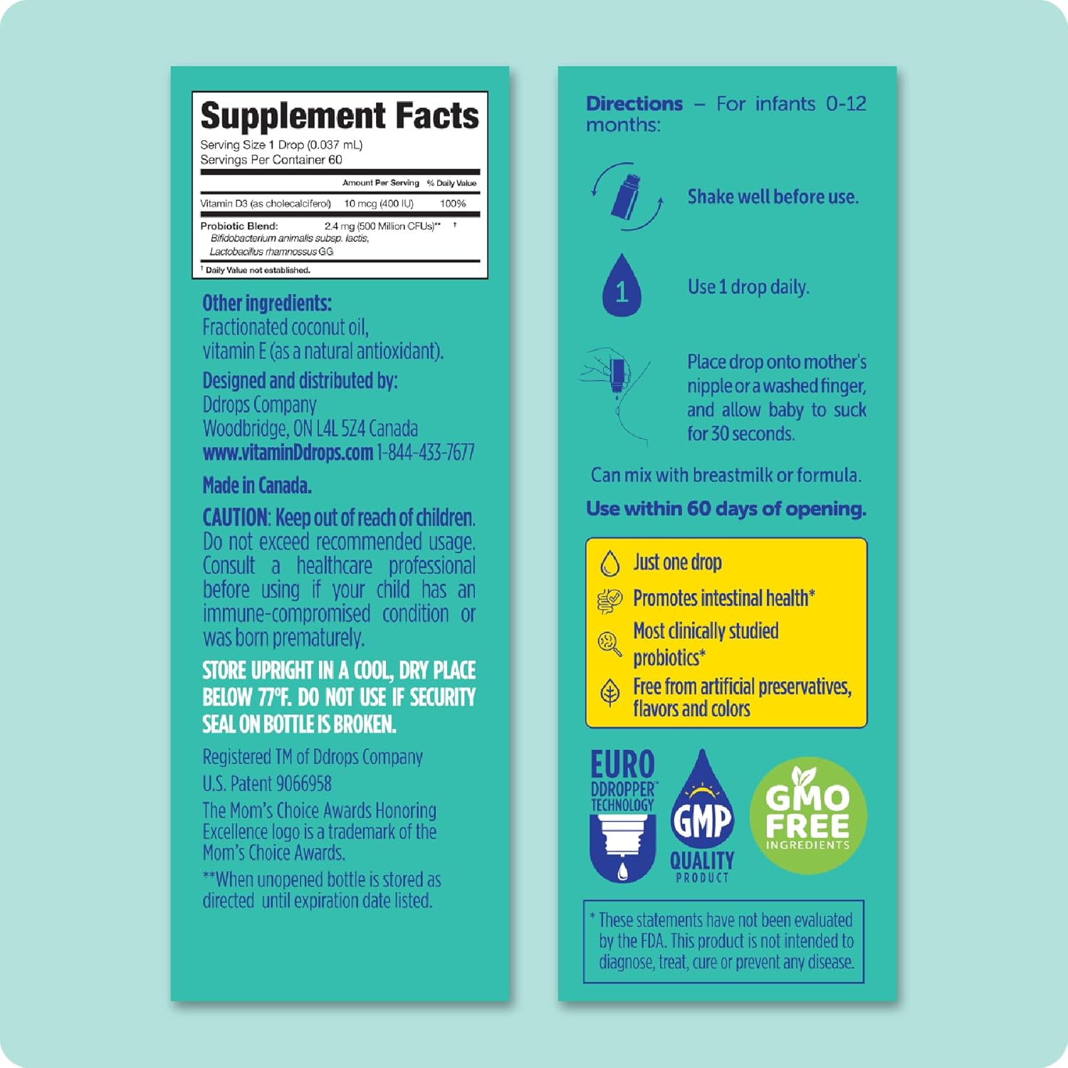 About this item Just one drop a day provides baby with 500 million CFU of gut-friendly bacteria and 400 IU of vitamin D. Safe for newborns, 0 months + Clinically proven to support immune and digestive health. Contains 400 IU of pure vitamin D3, which helps support healthy bone development. No artificial preservatives, flavors or colours. GMO free. › See more product details,Just one drop a day provides baby with 500 million CFU of gut-friendly bacteria and 400 IU of vitamin D,Safe for newborns, 0 months +,Clinically proven to support immune and digestive health,Contains 400 IU of pure vitamin D3, which helps support healthy bone development,No artificial preservatives, flavors or colours. GMO free