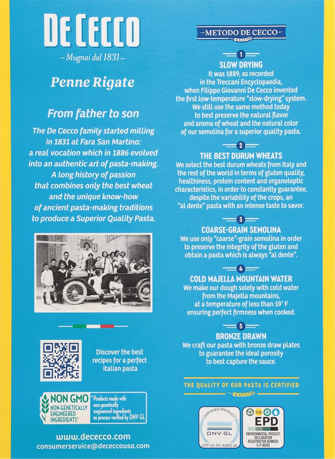Penne Rigate are part of the short, diagonal cut, ridged pasta family and are one of the most well-known type of pasta, as well as being the most versatile in the kitchen. In Italian, the term "Penne" refers to the goose feather which was used historically to write with and was cut on a diagonal to achieve a really thin tip. The shape, obtained from a pasta tube, can be smooth or ridged, of varying length and has the typical diagonal cut of a quill. Penne are one of the few types of pasta for which there is an exact date when it was created. Indeed, in 1865, a pasta-maker from San Martino d'Albaro (Genoa), Giovanni Battista Capurro, requested and obtained a patent for a diagonal cutting machine. The patent was important because it meant the fresh pasta could be cut like a quill without crushing it and in different lengths from 3 to 5 centimetres (mezze "half" penne or penne). The document preserved in the Central Archive of the State of Rome reads: "Up until now, a diagonal cut could only be made by hand with a pair of scissors which, in addition to being slow and time-consuming, also resulted in an irregular cut which flattened the pasta". Penne Rigate are perfect for preparing oven-baked pasta or pasta dishes served with meat sauces made from pork or beef. This pasta is equally as good with vegetable based sauces and more in general, due to its versatility, for any recipe from the Mediterranean tradition, such as the classic condiment with tomato, basil, extra virgin olive oil and a sprinkling of parmesan. A classic combination is with Arrabbiata sauce. Available in 16.0 oz and 5 lb Contains 1-16 oz box 100% Durum Wheat Semolina Made in Italy Cooking time: 12 min - Al dente: 10 min De Cecco gently grinds the heart of each grain, mixes it with cold spring water, then kneads the dough slowly. This results in pasta with the exceptional de Cecco aroma, flavor, and consistency. Pasta easily cooks to perfection, has a great firm texture, and a delicious “fresh” pasta taste. It has a rougher surface, which helps the sauce stick to it. Since 1886 we have liked our pasta to be bronze drawn and slowly dried because we like it to fall into the plate full of taste, rough and always "al dente". Even though our taste has not changed, as we feel the same love for tradition, we have continued to improve our production technologies. Make de Cecco pasta the secret ingredient for your most amazing dishes.Buon Appetito! Penne Rigate are part of the short, diagonal cut, ridged pasta family and are one of the most well-known type of pasta, as well as being the most versatile in the kitchen. In Italian, the term "Penne" refers to the goose feather which was used historically to write with and was cut on a diagonal to achieve a really thin tip. The shape, obtained from a pasta tube, can be smooth or ridged, of varying length and has the typical diagonal cut of a quill. Penne are one of the few types of pasta for which there is an exact date when it was created. Indeed, in 1865, a pasta-maker from San Martino d'Albaro (Genoa), Giovanni Battista Capurro, requested and obtained a patent for a diagonal cutting machine. The patent was important because it meant the fresh pasta could be cut like a quill without crushing it and in different lengths from 3 to 5 centimetres (mezze "half" penne or penne). The document preserved in the Central Archive of the State of Rome reads: "Up until now, a diagonal cut could only be made by hand with a pair of scissors which, in addition to being slow and time-consuming, also resulted in an irregular cut which flattened the pasta". Penne Rigate are perfect for preparing oven-baked pasta or pasta dishes served with meat sauces made from pork or beef. This pasta is equally as good with vegetable based sauces and more in general, due to its versatility, for any recipe from the Mediterranean tradition, such as the classic condiment with tomato, basil, extra virgin olive oil and a sprinkling of parmesan. A classic combination is with Arrabbiata sauce. Available in 16.0 oz and 5 lb,Contains 1-16 oz box,100% Durum Wheat Semolina,Made in Italy,Cooking time: 12 min - Al dente: 10 min,Shaped through Bronze Dies to create a rough surface to better retain sauce,Slowly Dried at low Temperature to Preserve Nutritional Properties. GMO Free. Kosher