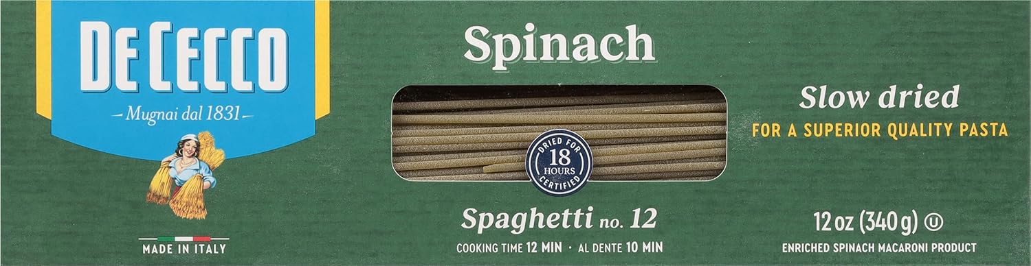 About this item Contains 1-12oz Spinach Spaghetti Good source of protein, thiamin, folic acid, iron, riboflavin, and niacin No GMO, no trans fat, no saturated fat, no sugar added. Kosher. Cooking time: 12 min - Al dente: 10 min Made in Italy No GMO, no trans fat, no saturated fat, no sugar added. Kosher. › See more product details,Contains 1-12oz Spinach Spaghetti,Good source of protein, thiamin, folic acid, iron, riboflavin, and niacin,No GMO, no trans fat, no saturated fat, no sugar added. Kosher,Cooking time: 12 min - Al dente: 10 min,Made in Italy,No GMO, no trans fat, no saturated fat, no sugar added. Kosher