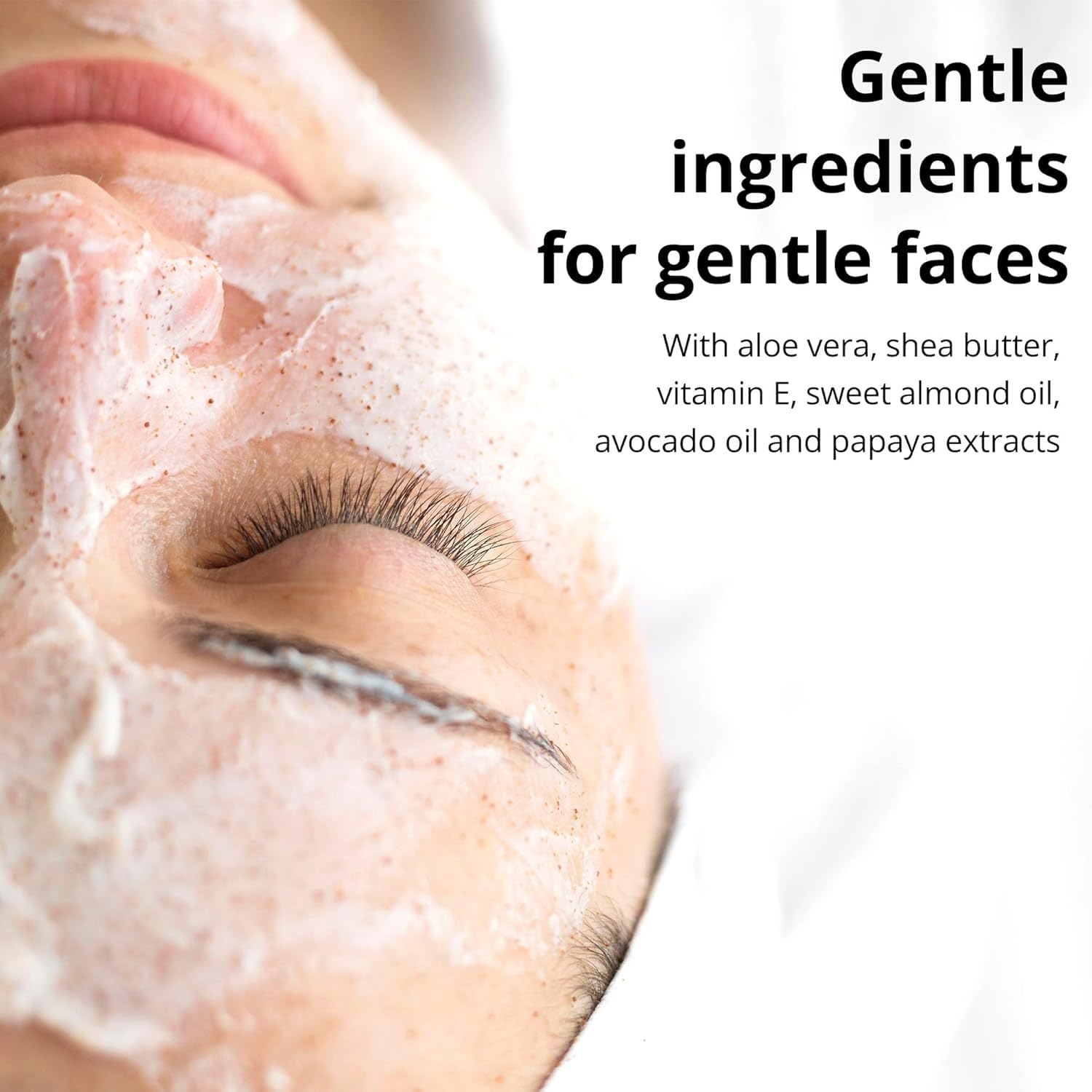 Gentle ingredients for gentle faces. With aloe vera, shea butter, vitamin E, sweet almond oil, avocado oil and papaya extracts, our face exfoliant unclogs pores gently, leaving your skin feeling soft, smooth and refreshed