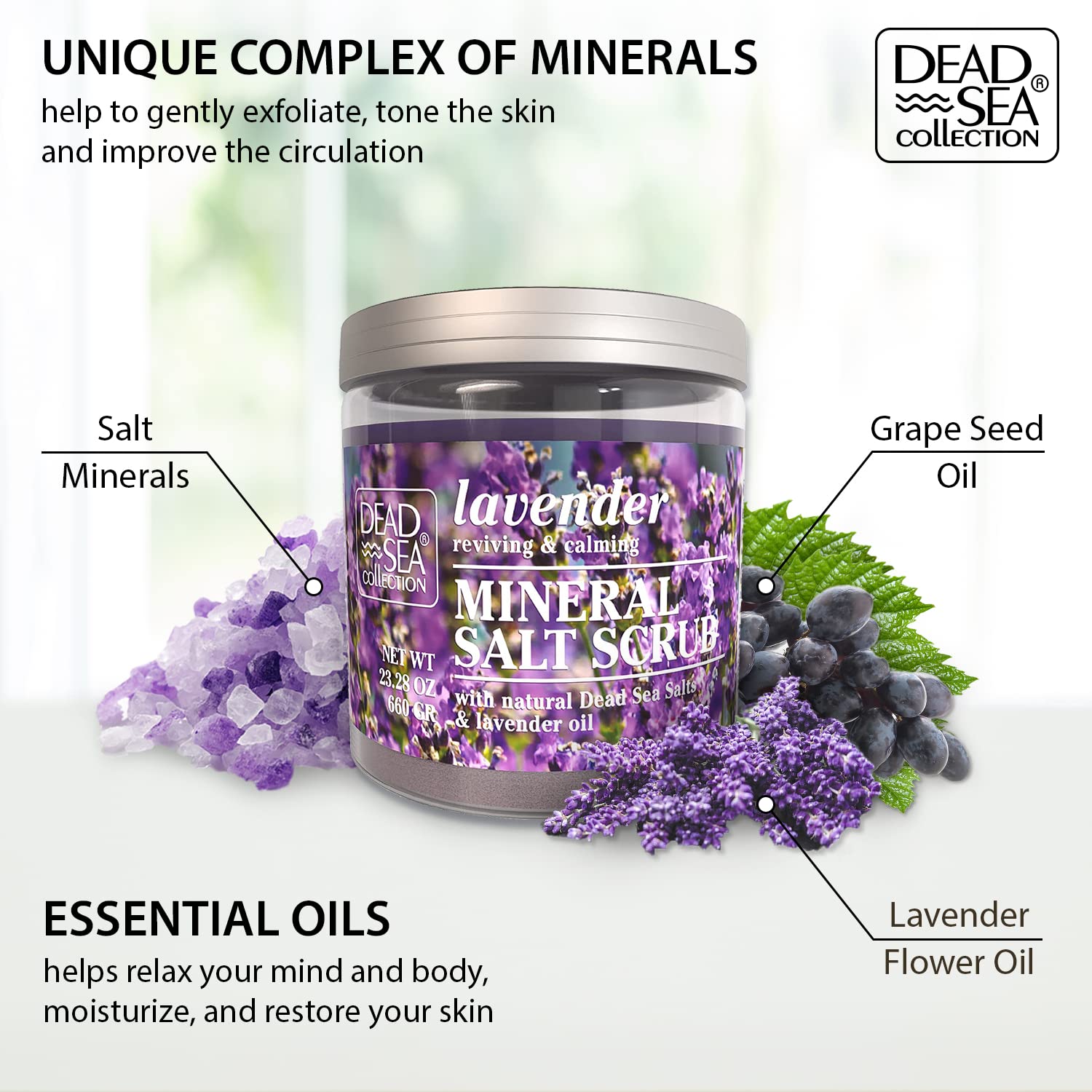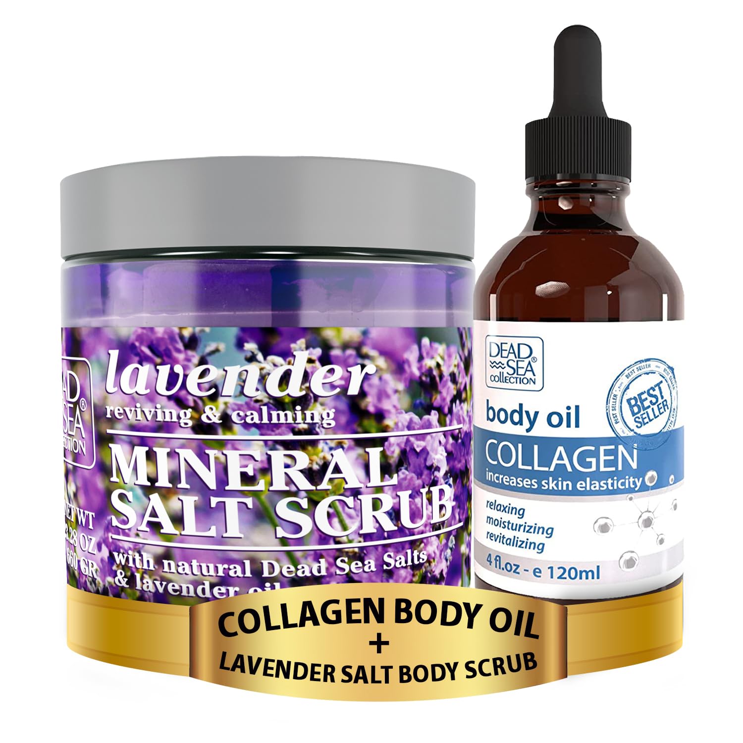 Dead Sea Collection Body Oil With Collagen (4 Fl.Oz) And Lavender Salt Body Scrub (23.28 Oz) With Organic Oils And Natural Dead Sea Minerals - Bundle