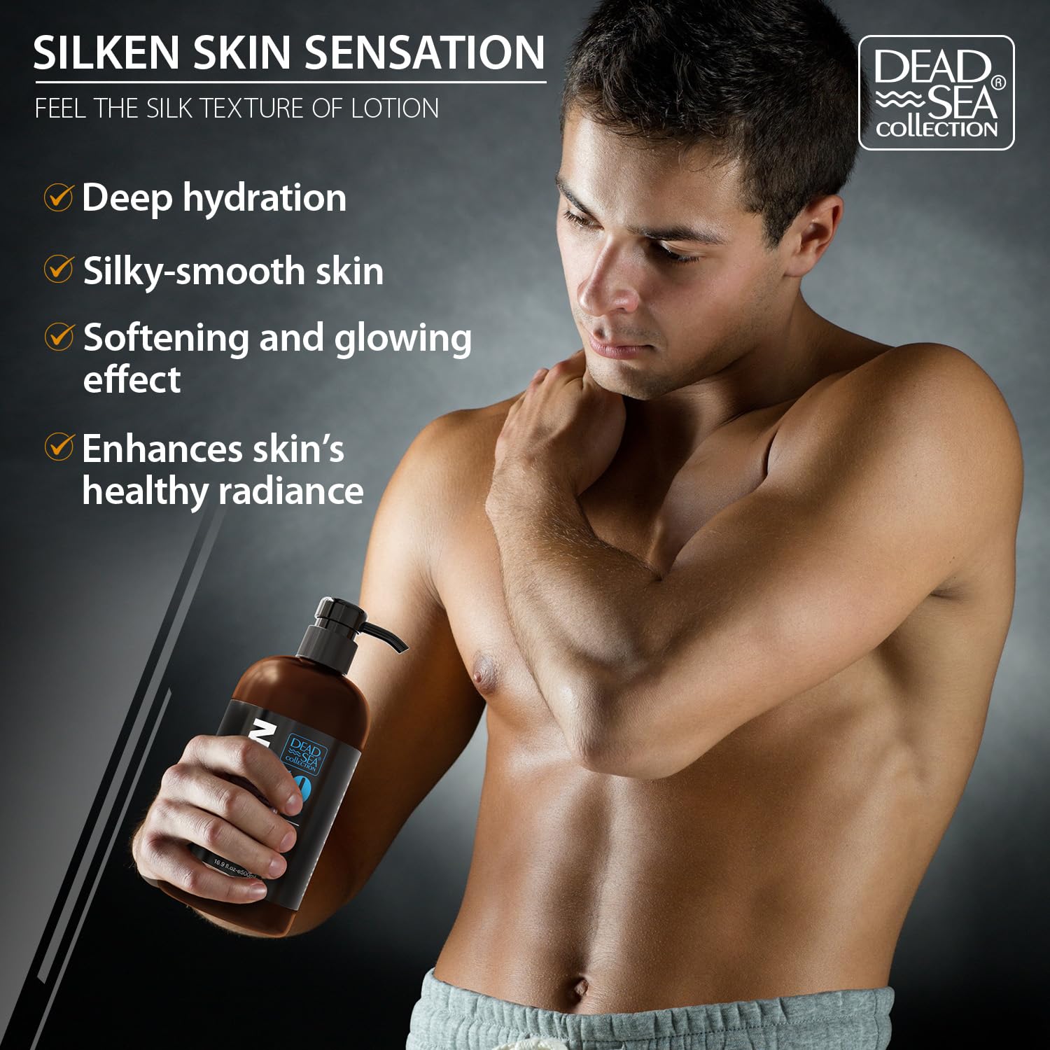 About this item Intensive Hydration with Sandalwood Oil β Dead Sea Collection Men's Top 10 Body Lotion combines powerful hydration with the nourishing benefits of Sandalwood Oil, providing deep moisture and lasting comfort for dry skin. Sandalwood oil helps to rejuvenate and protect the skin, leaving it soft and revitalized. Masculine Elegance - Crafted specifically for men, this lotion for dry skin seamlessly integrates into grooming routine, ensuring a strong, smooth touch. With Pure Minerals from the Dead Sea - Harness the power of Dead Sea minerals in body lotion, promoting skin vitality and elasticity. Experience a revitalizing blend that nourishes, leaving your skin with a radiant glow. Convenient Pump Dispenser - Experience ease with the moisturizer pump, delivering just the right amount for effective hydration without wastage. Nourishing Care - Formulated as a skin moisturizer, this body lotion for dry skin is go-to solution, offering the ultimate nourishment for supple, radiant skin. βΊ See more product details,Intensive Hydration with Sandalwood Oil β Dead Sea Collection Men's Top 10 Body Lotion combines powerful hydration with the nourishing benefits of Sandalwood Oil, providing deep moisture and lasting comfort for dry skin. Sandalwood oil helps to rejuvenate and protect the skin, leaving it soft and revitalized,Masculine Elegance - Crafted specifically for men, this lotion for dry skin seamlessly integrates into grooming routine, ensuring a strong, smooth touch,With Pure Minerals from the Dead Sea - Harness the power of Dead Sea minerals in body lotion, promoting skin vitality and elasticity. Experience a revitalizing blend that nourishes, leaving your skin with a radiant glow,Convenient Pump Dispenser - Experience ease with the moisturizer pump, delivering just the right amount for effective hydration without wastage,Nourishing Care - Formulated as a skin moisturizer, this body lotion for dry skin is go-to solution, offering the ultimate nourishment for supple, radiant skin