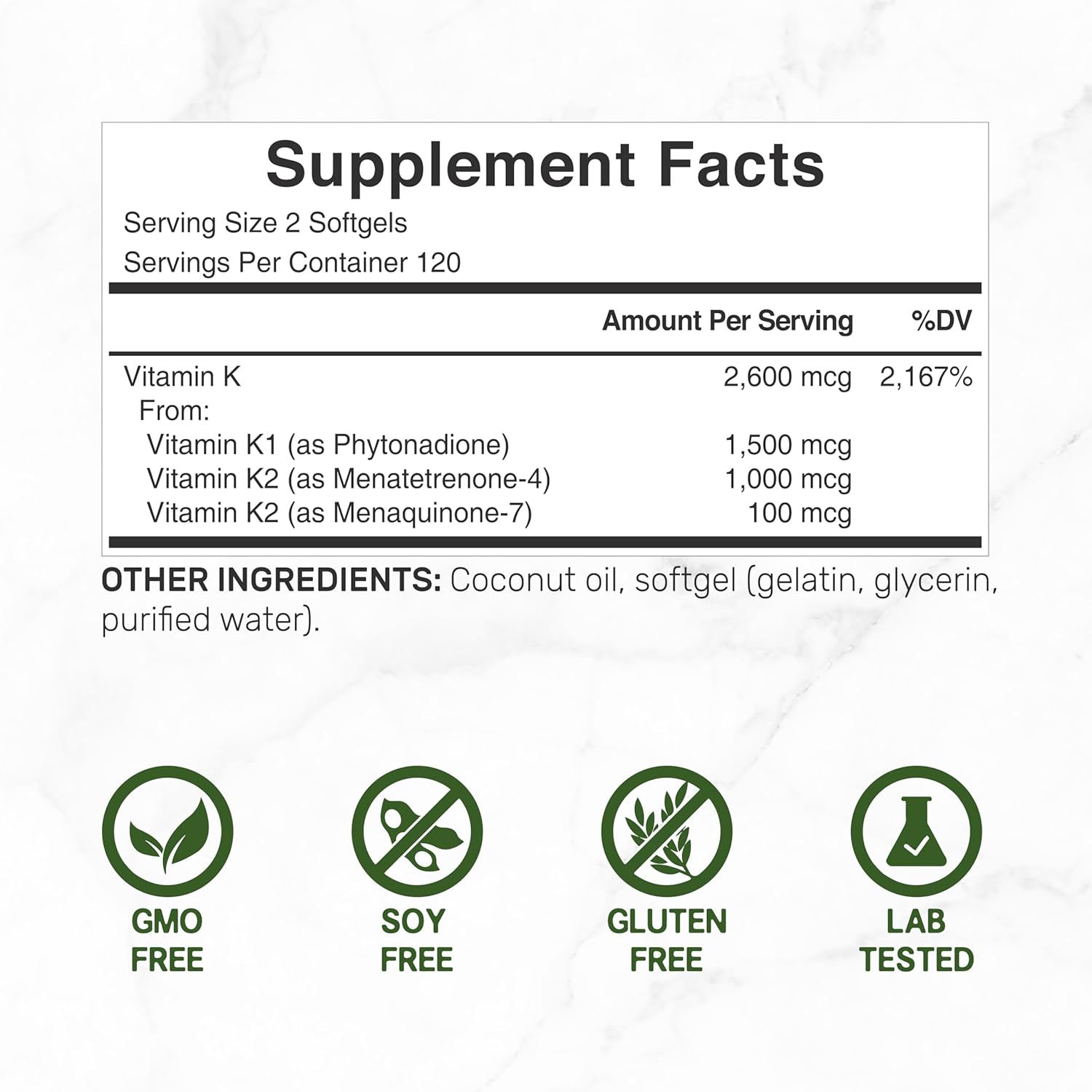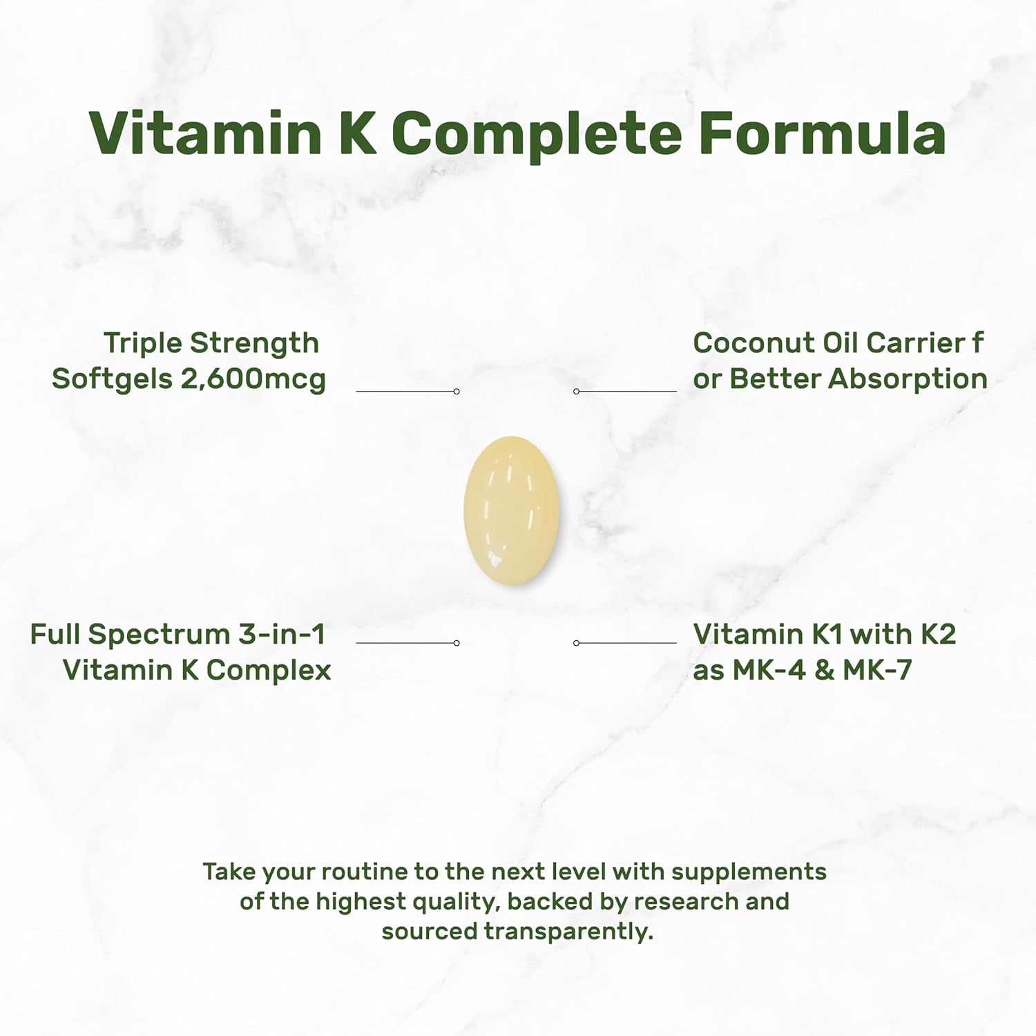 High-Potency Vitamin K Complex: Our Premium K Complete Delivers A Powerful Blend Of Vitamin K1 (1500Mcg), K2 Mk-7 (1000Mcg), And K2 Mk-4 (100Mcg) Per Serving, Supporting Bone And Heart Health