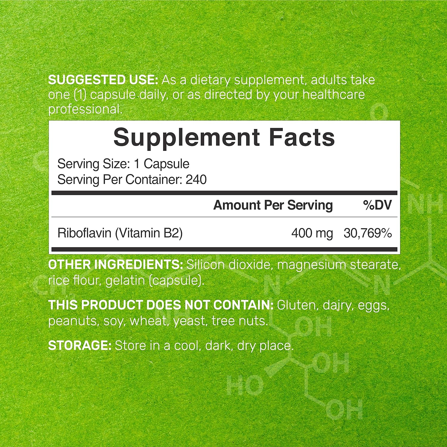 3 >Dosage & Servings β Enjoy 240 capsules per bottle that only take 1 capsule per serving. A bulk 240-day supply that contains 400mg vitamin B2 with every dose