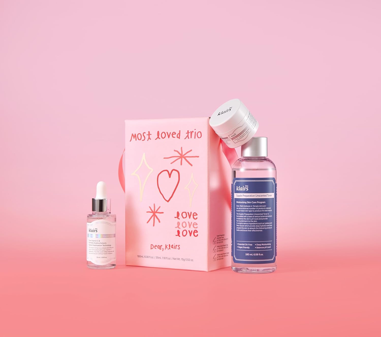 About this item Global Bestsellers: Klairsā Unscented Toner, Vitamin Drop, and Vitamin E Mask are loved worldwide, with 5M+, 3M+, and 1M+ units sold (as of Dec 2023). Achieve flawless skin this holiday season with these top picks. #1 Skincare: Klairs leads on Amazon with the Unscented Toner as the top toner and the Vitamin Drop as Klarisā best-selling product. Pair with the Vitamin E Mask for enhanced results. Glass Skin in 3 Easy Steps: Get radiant Glass Skin with Klarisā routine: Toner ? Vitamin Serum ? Vitamin E Mask. Hydrate, revitalize and lock in 24-hour moisture effortlessly. Perfect Holiday Gift Set: The ideal gift for sensitive skin, Most Loved Package is perfect for Christmas and New Year. Treat your loved ones with these holiday must-haves. Unlock K-Beauty Radiance: Discover the Korean skincare secret to glowing skin. Klarisā toner, serum, and mask deliver clear, luminous, and healthy skin, even for sensitive types. āŗ See more product details,Global Bestsellers: Klairsā Unscented Toner, Vitamin Drop, and Vitamin E Mask are loved worldwide, with 5M+, 3M+, and 1M+ units sold (as of Dec 2023). Achieve flawless skin this holiday season with these top picks,#1 Skincare: Klairs leads on Amazon with the Unscented Toner as the top toner and the Vitamin Drop as Klarisā best-selling product. Pair with the Vitamin E Mask for enhanced results,Glass Skin in 3 Easy Steps: Get radiant Glass Skin with Klarisā routine: Toner ? Vitamin Serum ? Vitamin E Mask. Hydrate, revitalize and lock in 24-hour moisture effortlessly,Perfect Holiday Gift Set: The ideal gift for sensitive skin, Most Loved Package is perfect for Christmas and New Year. Treat your loved ones with these holiday must-haves,Unlock K-Beauty Radiance: Discover the Korean skincare secret to glowing skin. Klarisā toner, serum, and mask deliver clear, luminous, and healthy skin, even for sensitive types