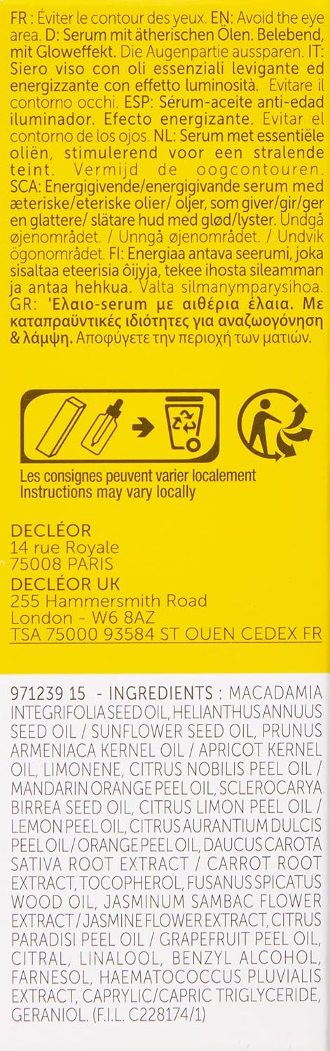 Product Description Decleor Aromessence Green Mandarin Ingredients 971239 15 – Ingredients: MACADAMIA INTEGRIFOLIA SEED OIL • Helianthus ANNUUS SEED OIL / SUNFLOWER SEED OIL • PRUNUS ARMENIACA KERNEL OIL / APRICOT Kernel OIL • Limonene • CITRUS NOBIL. IS PEEL OIL / MANDARIN ORANGE PEEL OIL • SCLEROCARYA BIRREA SEED OIL • CITRUS LIMON PEEL OIL • CITRUS AURANTIUM SWEET PEEL OIL / ORANGE PEEL OIL • DAUCUS CAROTA SATIVA ROOT EXTRACT TO TOCOPHER. OL • FUSANUS SPICATUS WOOD OIL • JASMINUM SAMBAC FLOWER EXTRACT / JASMINE FLOWER E P.when('A').execute(function(A) { A.on('a:expander:toggle_description:toggle:collapse', function(data) { window.scroll(0, data.expander.$expander[0].offsetTop-100); }); }); Directions Pour 3 drops of oil into the palm of your hand and apply morning and night before moisturizing cream to clean, dry skin. Avoid eye contour See more,Reduce appearance of fine lines and wrinkles,Re-energise,Anti-aging