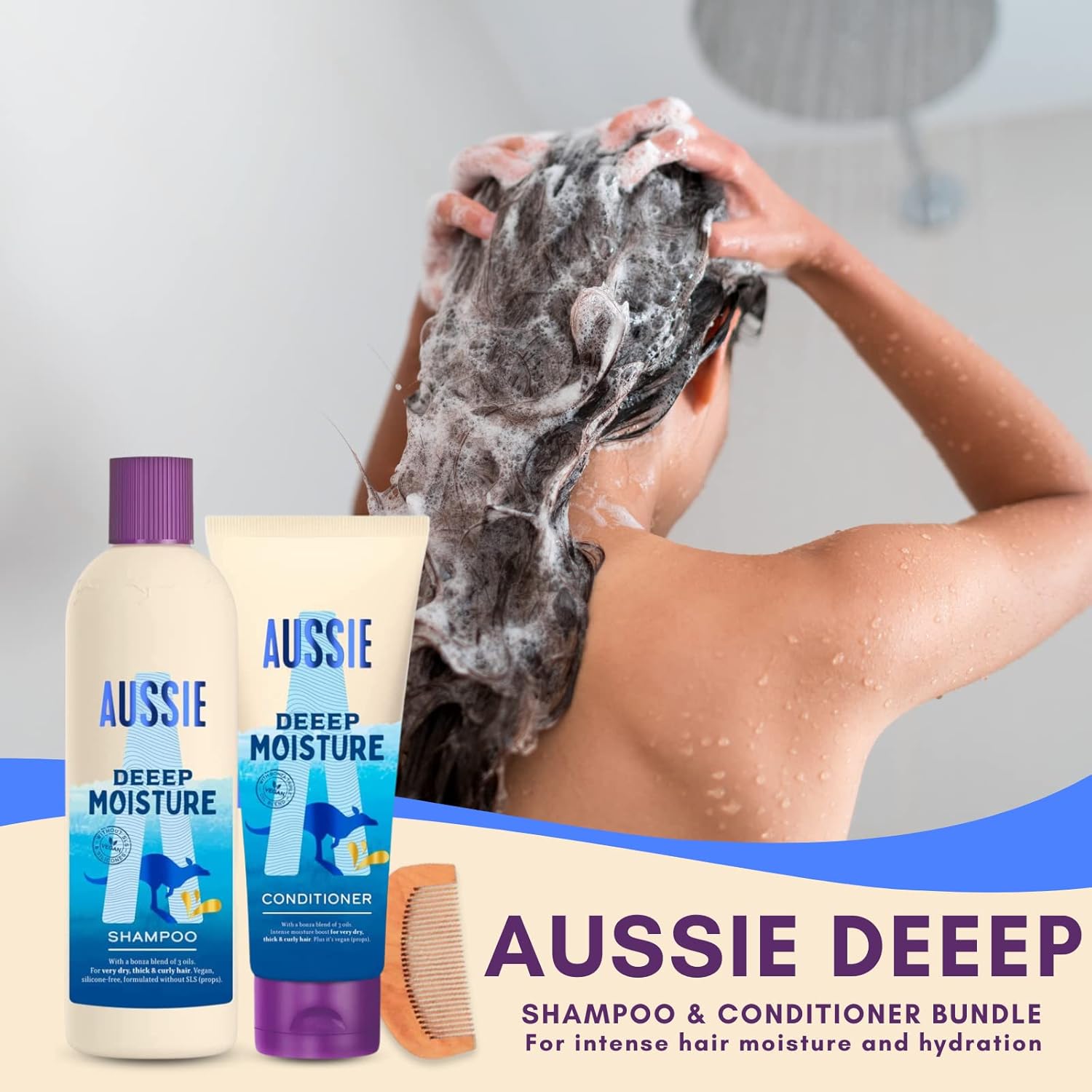 About this item ?? TREAT YOUR HAIR WITH INTENSE HYDRATION: Our shampoo and conditioner bundle contains a triple blend of natural oils that helps your hair stay hydrated and protected from the damage effects of dry hair. ?? SLS AND SILICONE FREE SHAMPOO: Aussie Deeep Moisture Shampoo can cleanse and remove residue deeply from your scalp while restoring hydration. Formulated without SLS and silicone-free. ?? DEEP MOISTURE: Aussie Deeep Moisture Conditioner has intense hydration formula which is ideal for dry, thick & curly hair. It leaves a sweet, yummy scent in your hair making you feel clean and fresh. ?? EFFORTLESS HAIR TREAT: Aside from the hair benefits that come with our bundle. We also include a CHG hair comb to make your daily hair regimen easy and convenient. ?? RECYCLABLE & CRUELTY-FREE PRODUCTS: Aussie's product bottles are totally recyclable. Its formula is free from animal-derived ingredients as certified by PETA. › See more product details,?? TREAT YOUR HAIR WITH INTENSE HYDRATION: Our shampoo and conditioner bundle contains a triple blend of natural oils that helps your hair stay hydrated and protected from the damage effects of dry hair,?? SLS AND SILICONE FREE SHAMPOO: Aussie Deeep Moisture Shampoo can cleanse and remove residue deeply from your scalp while restoring hydration. Formulated without SLS and silicone-free,?? DEEP MOISTURE: Aussie Deeep Moisture Conditioner has intense hydration formula which is ideal for dry, thick & curly hair. It leaves a sweet, yummy scent in your hair making you feel clean and fresh,?? EFFORTLESS HAIR TREAT: Aside from the hair benefits that come with our bundle. We also include a CHG hair comb to make your daily hair regimen easy and convenient,?? RECYCLABLE & CRUELTY-FREE PRODUCTS: Aussie's product bottles are totally recyclable. Its formula is free from animal-derived ingredients as certified by PETA