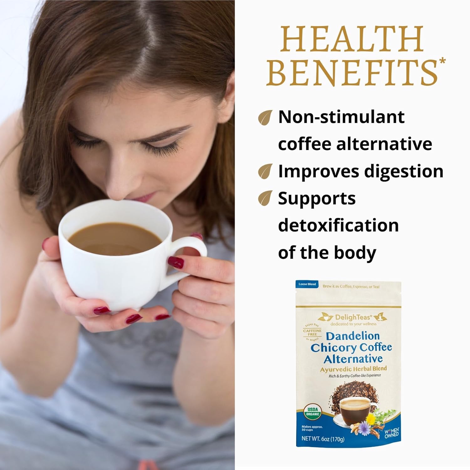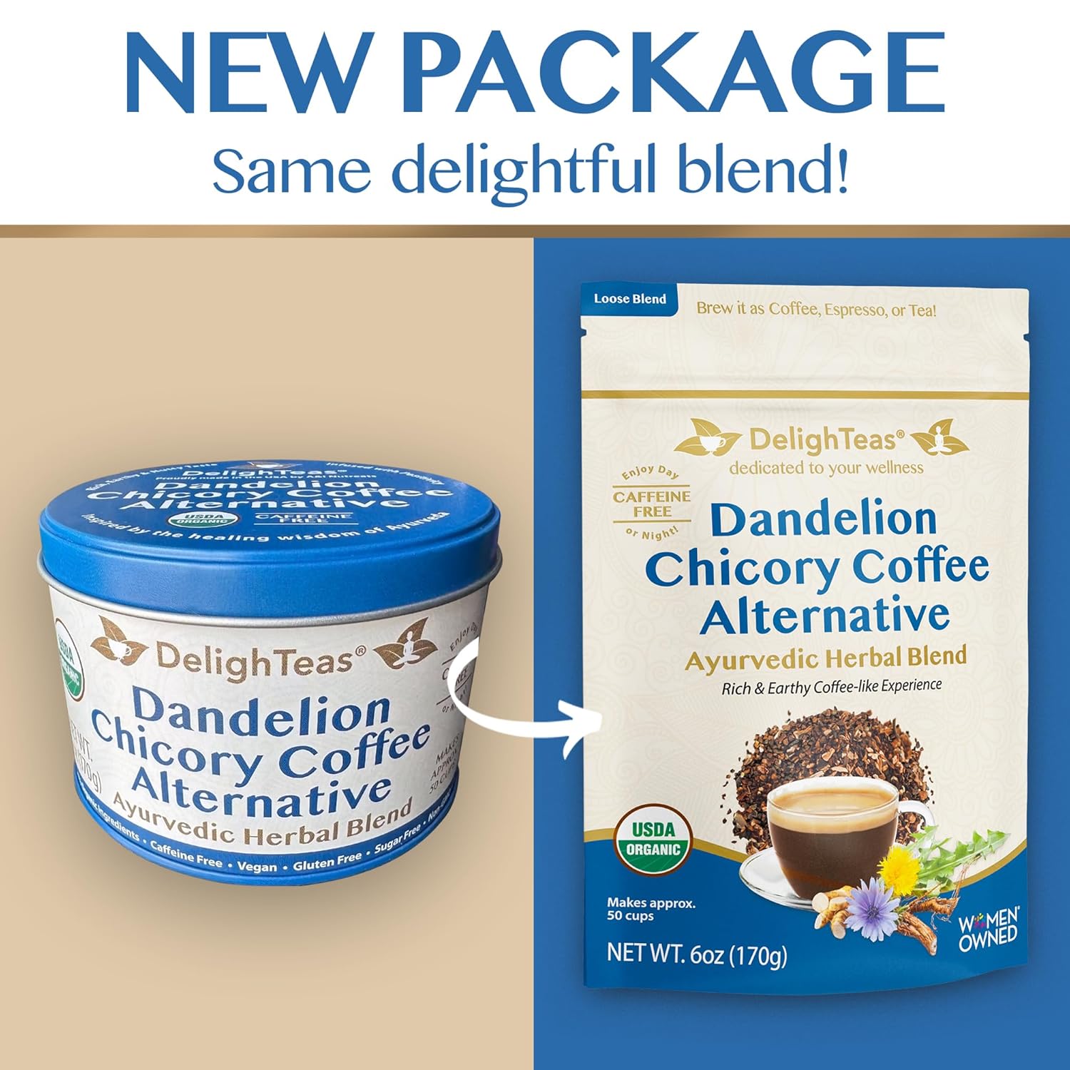 Delighteas Organic Coffee Alternative | Ayurvedic Herbal Chicory Dandelion Coffee | Coffee Substitute | Usda Organic, Caffeine Free, Gluten Free | With Sweet Notes Of Carob | 50 Servings, 6Oz