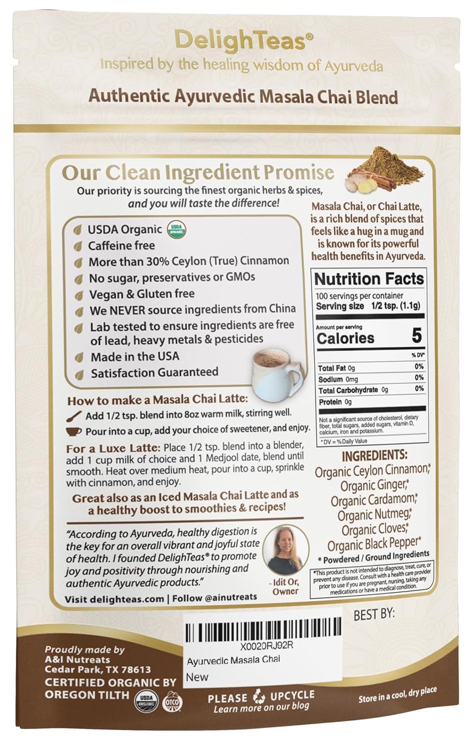 100% Organic Ingredients & Non-Gmo: You Will Taste The Difference. Our Priority Is Sourcing The Finest Organic Herbs & Spices. We Never Source Ingredients From China, And Only Use Ceylon "True" Cinnamon, Which Is Less Widely Available & More Expensive Compared To The Commonly Used Cassia "Chinese" Cinnamon