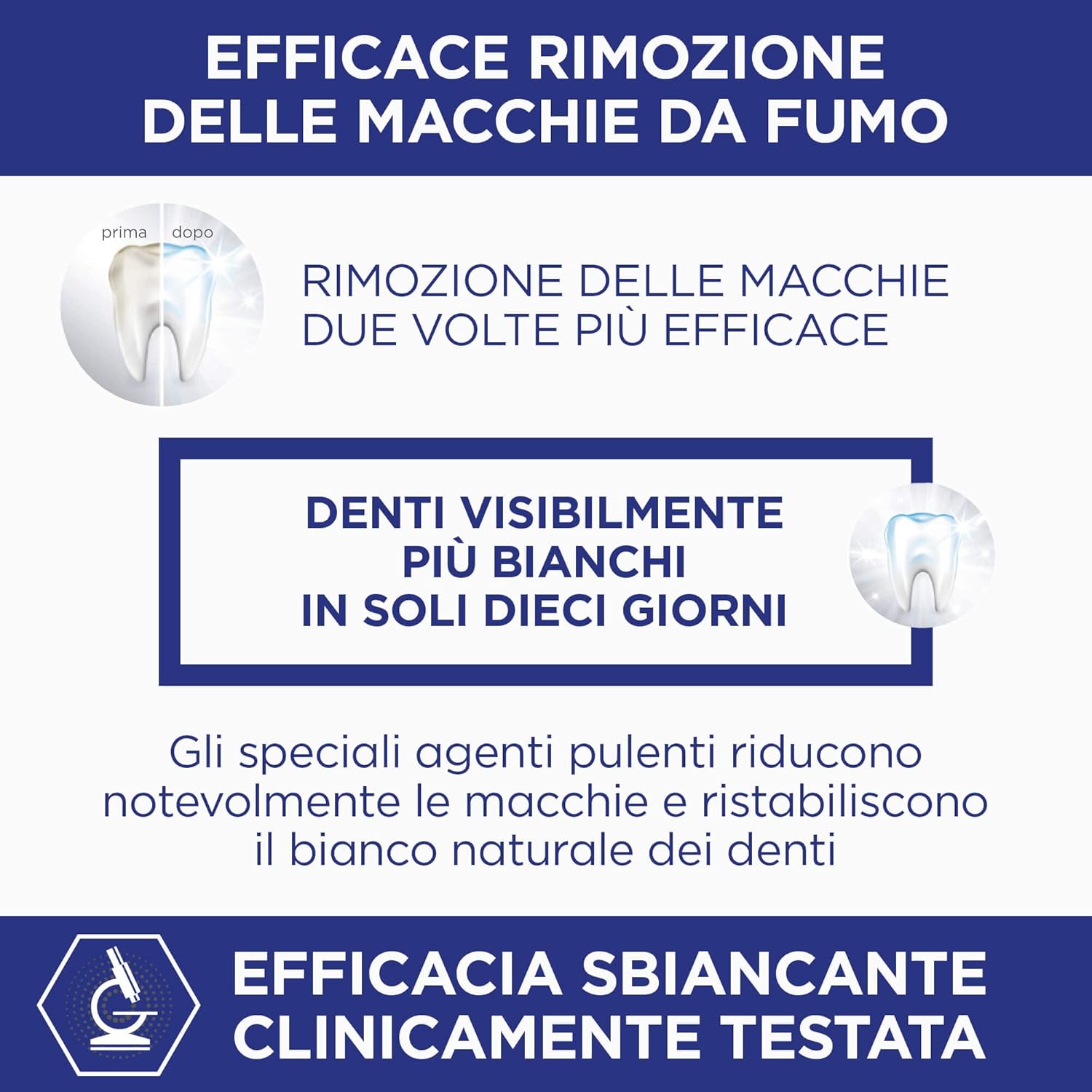 Benefits: removes stains, restores the natural white of the teeth, respects the enamel and provides optimal protection against plaque, decay and gum problems