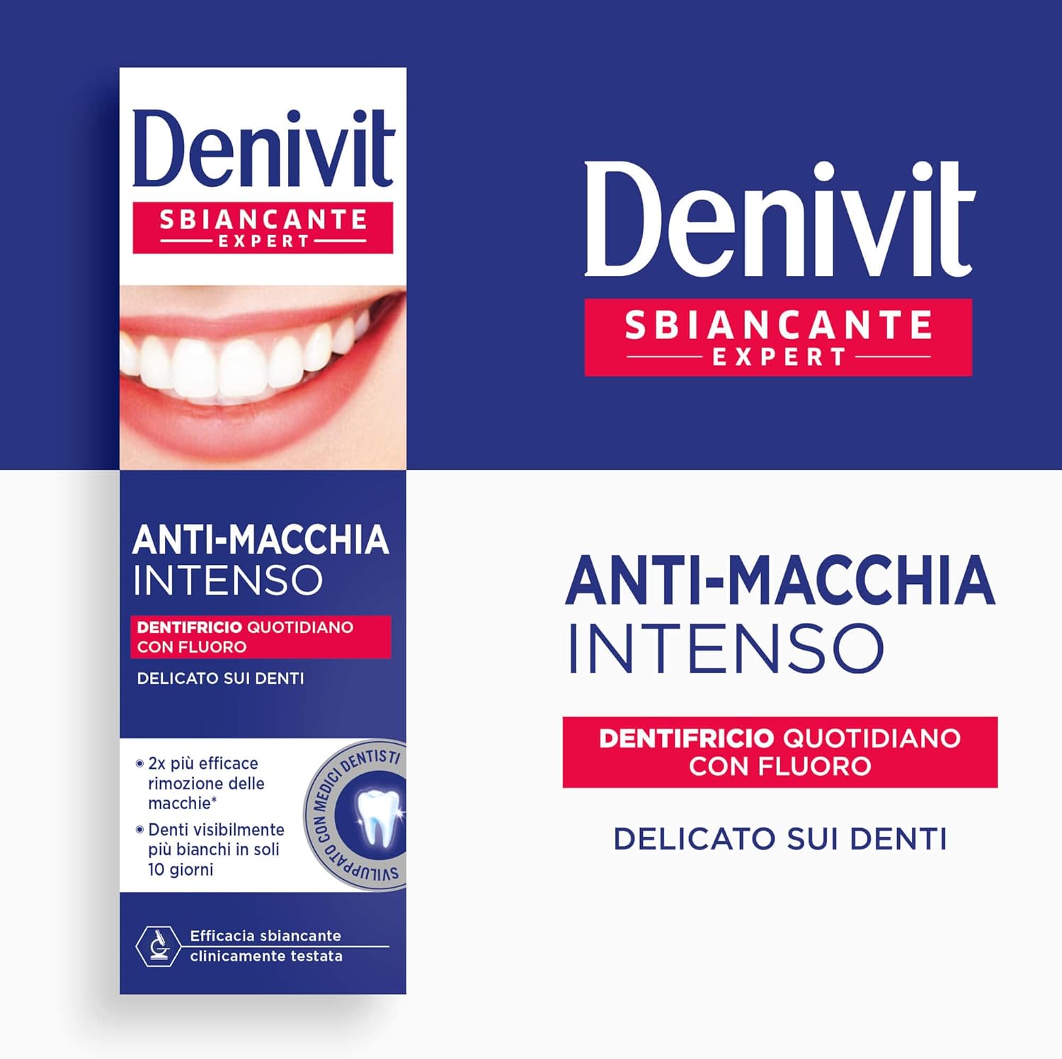 About this item Intense Anti-Stain Toothpaste: Daily Fluoride Toothpaste, Effective in Removing Stains and for Visibly White Teeth in Just 10 Days Benefits: removes stains, restores the natural white of the teeth, respects the enamel and provides optimal protection against plaque, decay and gum problems How to use: For satisfactory results, use for 2-3 minutes at least twice a day, replacing the brush every three months and flossing regularly Gentle on teeth: Denivit can be used daily thanks to the delicate ingredients of its formula that respect the tooth enamel by effectively dissolving stains WHITE: The package contains a whitometer to monitor the whitening effect before and after regular use of Denivit › See more product details,Intense Anti-Stain Toothpaste: Daily Fluoride Toothpaste, Effective in Removing Stains and for Visibly White Teeth in Just 10 Days,Benefits: removes stains, restores the natural white of the teeth, respects the enamel and provides optimal protection against plaque, decay and gum problems,How to use: For satisfactory results, use for 2-3 minutes at least twice a day, replacing the brush every three months and flossing regularly,Gentle on teeth: Denivit can be used daily thanks to the delicate ingredients of its formula that respect the tooth enamel by effectively dissolving stains,WHITE: The package contains a whitometer to monitor the whitening effect before and after regular use of Denivit
