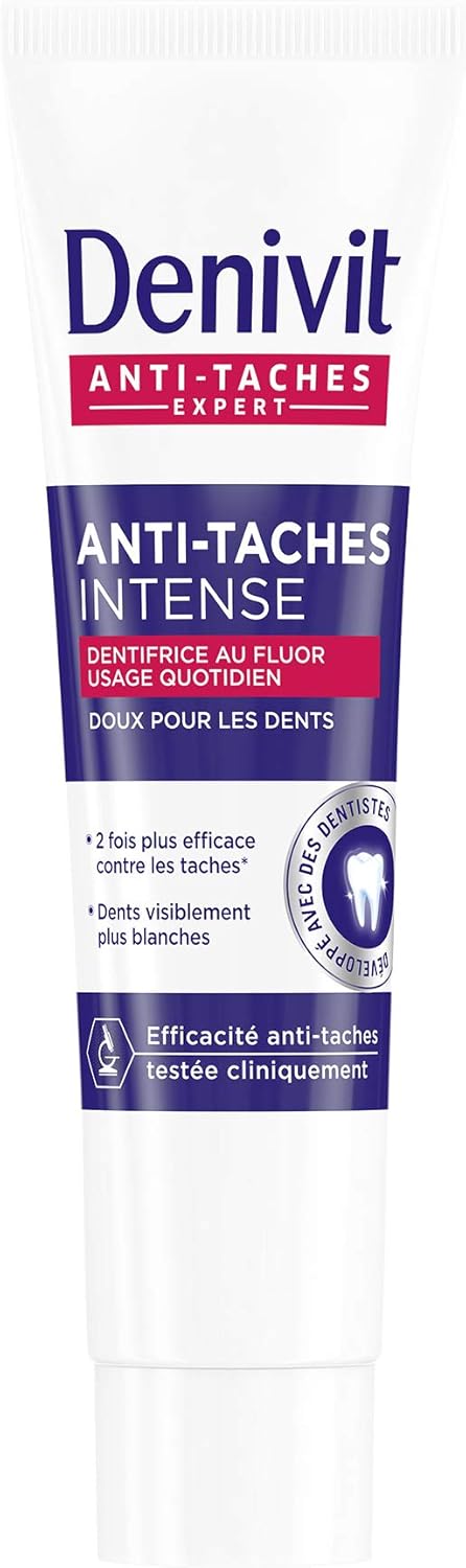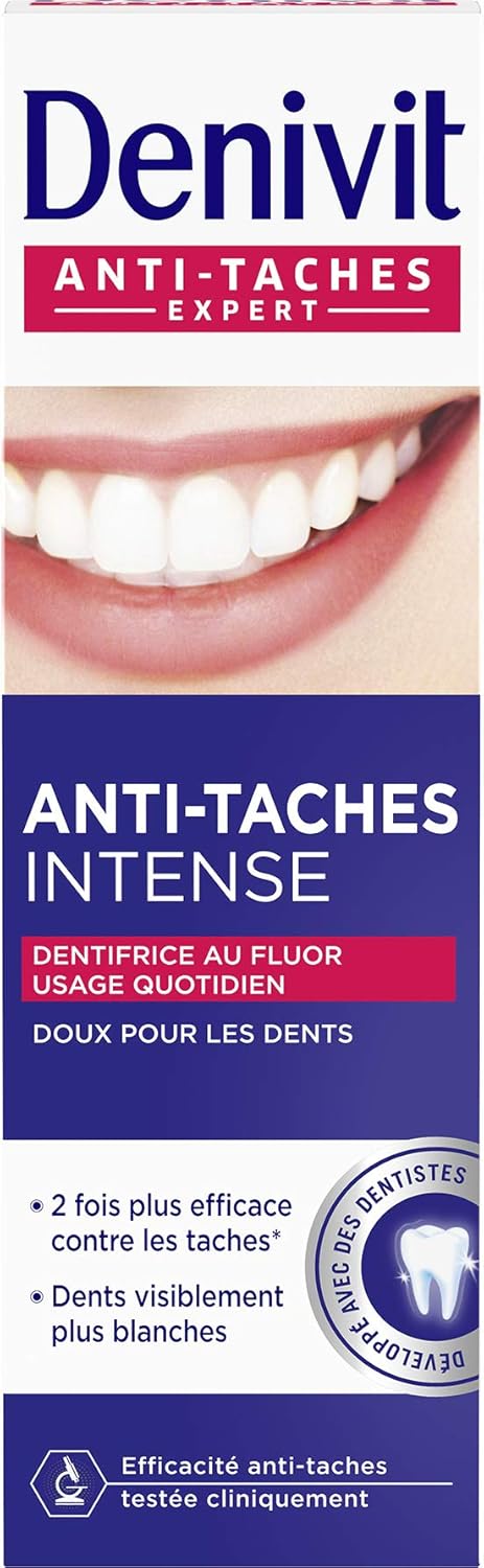 Product Description The formula of this toothpaste has been clinically tested and the high cleaning performance has been proven. Daily cleaning of teeth with Denivit anti-taches intensively reduces the presence of stains. Safety Warning Warning: for external use only. Do not swallow. Keep out of reach of children. If irritated, discontinue use and consult a dentist,Effectively removes stains from tobacco, certain drinks and foods,Gives the teeth their natural whiteness and provides a radiant smile,Enamel gentle and safe,Provides optimal protection against plaque, tooth decay and gum problems,The stain protection complex dissolves stains on the surface of the teeth while protecting the tooth enamel