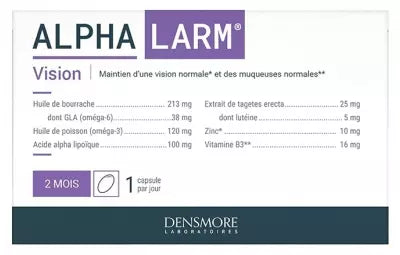 Densmore Alphalarm Vision 60 Capsules Is A Dietary Supplement Based On Borage Oil And Fish Oil To Help Maintain Normal Vision. Its Formula, Enriched With Zinc, Essential For Maintaining Normal Vision, And Vitamin B3, Which Promotes Healthy Mucous Membranes, Offers Complete Protection For The Eyes. This Dietary Supplement Strengthens The Eye'S Internal Defenses By Protecting The Cornea And Conjunctiva, While Stimulating Tear Production. It Thus Helps To Improve Eye Hydration And Reinforce The Eye