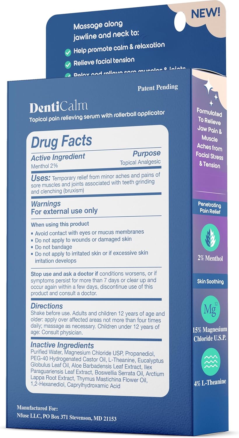 About this item FIRST & ONLY OTC TREATMENT for TEETH GRINDING & FACIAL TENSION: DentiCalm is the first and only over-the-counter treatment that delivers targeted relief for pain, facial tension, and stress from jaw clenching & teeth grinding without a prescription. DE-STRESS YOUR JAW - Magnesium-infused formula relaxes overworked jaw muscles, reducing tension that often leads to TMJ-related pain, tightness and discomfort. GLASS ROLLER BALL FACE MASSAGER: Enjoy a mess-free, easy application with our cool-to-the-touch glass roller ball face massager, designed to massage sore facial muscles and release facial tension. EUCALYPTUS MINT SCENT: An aromatherapy blend of essential oils clears your mind so you can relax. PHARMACY-GRADE INGREDIENTS FOR EFFECTIVE RELIEF: Made with USP Menthol for cooling pain relief, USP Magnesium Chloride for facial muscle relaxation, L-Theanine for stress reduction, and natural extracts to calm and soothe. CONVENIENT, TRAVEL-READY DESIGN: DentiCalm's fast-absorbing formula in a portable applicator allows for quick, on-the-go relief, perfect for use anytime you experience jaw pain, headaches, or neck and shoulder tension. FORMULATED FOR FACIAL SKIN: suitable for all skin types, gentle enough for daily use; free of parabens and phthalates and made in the USA. RECOMMENDED FOR: DentiCalm offers temporary relief related to facial pain, teeth grinding, jaw clenching, jaw and facial tension, night guards, braces and retainers. โบ See more product details,FIRST & ONLY OTC TREATMENT for TEETH GRINDING & FACIAL TENSION: DentiCalm is the first and only over-the-counter treatment that delivers targeted relief for pain, facial tension, and stress from jaw clenching & teeth grinding without a prescription,DE-STRESS YOUR JAW - Magnesium-infused formula relaxes overworked jaw muscles, reducing tension that often leads to TMJ-related pain, tightness and discomfort,GLASS ROLLER BALL FACE MASSAGER: Enjoy a mess-free, easy application with our cool-to-the-touch glass roller ball face massager, designed to massage sore facial muscles and release facial tension,EUCALYPTUS MINT SCENT: An aromatherapy blend of essential oils clears your mind so you can relax,PHARMACY-GRADE INGREDIENTS FOR EFFECTIVE RELIEF: Made with USP Menthol for cooling pain relief, USP Magnesium Chloride for facial muscle relaxation, L-Theanine for stress reduction, and natural extracts to calm and soothe,CONVENIENT, TRAVEL-READY DESIGN: DentiCalm's fast-absorbing formula in a portable applicator allows for quick, on-the-go relief, perfect for use anytime you experience jaw pain, headaches, or neck and shoulder tension,FORMULATED FOR FACIAL SKIN: suitable for all skin types, gentle enough for daily use; free of parabens and phthalates and made in the USA,RECOMMENDED FOR: DentiCalm offers temporary relief related to facial pain, teeth grinding, jaw clenching, jaw and facial tension, night guards, braces and retainers