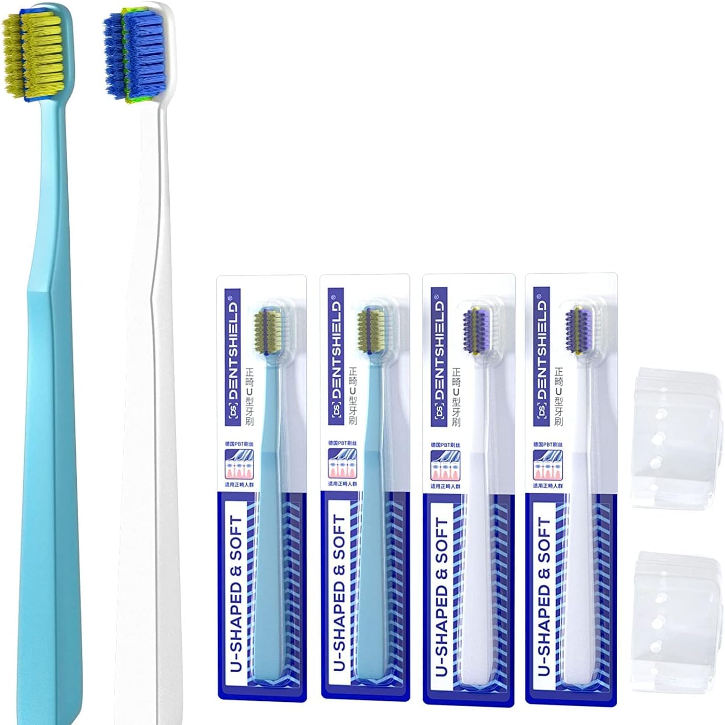ABOUT THE PRODUCT: 1 > New Upgraded Orthodontic Toothbrush: Wide headed design for the Orthodontic people. U-Shaped bristles closely fit the tooth, easily clean the area around your orthodontic appliances without hooking 2 > High Quality Soft Bristles: Carefully selected german PBT bristle , clean your teeth effectively without harming your gums.No shedding 3 > Food Grade Material: PP brushes handle without toxic and bad taste, straight handle is comfortableDENTSHIELD 4 Pcs Orthodontic Toothbrush for Braces U-Shaped Soft Bristle with 4 Toothbrush Head CoverBlue+White (4 Pack)