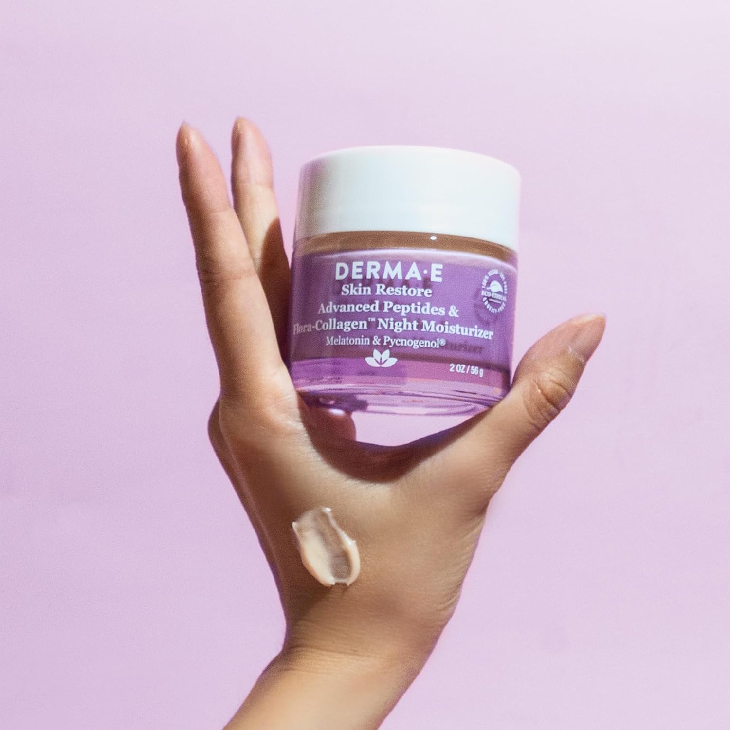 About this item ANTI-AGING NIGHT MOISTURIZER: Our luxurious night cream is formulated with anti-aging ingredients to nourish, repair and support collagen health for a more youthful, healthy-looking complexion. CLINICALLY PROVEN: In a 6-week clinical trial, 100% saw improved skin elasticity, 97% saw improved appearance of fine lines & wrinkles, 97% saw improved skin firmness, and 0% experienced irritation. ALL NATURAL FORMULA: Packed full of powerful natural ingredients, including: Pycnogenol helps to increase skin hydration; Plant-derived Flora-Collagen locks in hydration and Melatonin helps to reduce the signs of aging while fighting free radicals. DAILY SKIN CARE: In the evening, thoroughly cleanse face and neck before using the overnight moisturizer. Apply a rich layer of cream and gently massage into skin until it is absorbed. DERMA E: Clean beauty products that harness nature’s most effective ingredients. 100% vegan and cruelty-free, our eco-ethical skin care products contain no parabens, sulfates, mineral oil, petrolatum, lanolin, gluten, soy or GMOs, and are supplied in recyclable packaging. › See more product details,ANTI-AGING NIGHT MOISTURIZER: Our luxurious night cream is formulated with anti-aging ingredients to nourish, repair and support collagen health for a more youthful, healthy-looking complexion,CLINICALLY PROVEN: In a 6-week clinical trial, 100% saw improved skin elasticity, 97% saw improved appearance of fine lines & wrinkles, 97% saw improved skin firmness, and 0% experienced irritation,ALL NATURAL FORMULA: Packed full of powerful natural ingredients, including: Pycnogenol helps to increase skin hydration; Plant-derived Flora-Collagen locks in hydration and Melatonin helps to reduce the signs of aging while fighting free radicals,DAILY SKIN CARE: In the evening, thoroughly cleanse face and neck before using the overnight moisturizer. Apply a rich layer of cream and gently massage into skin until it is absorbed,DERMA E: Clean beauty products that harness nature’s most effective ingredients. 100% vegan and cruelty-free, our eco-ethical skin care products contain no parabens, sulfates, mineral oil, petrolatum, lanolin, gluten, soy or GMOs, and are supplied in recyclable packaging