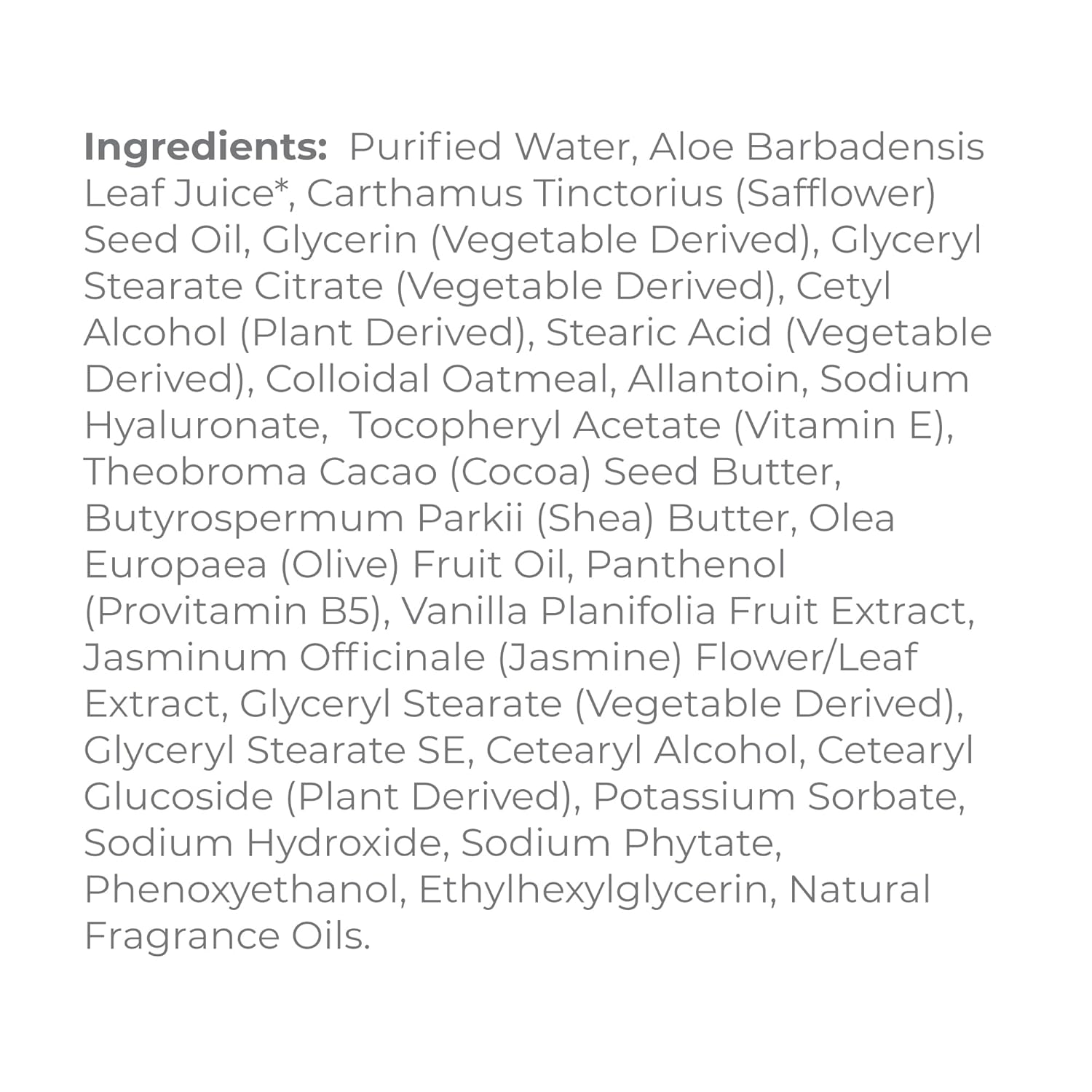 About this item ULTRA MOISTURIZING LOTION: This sensual jasmine vanilla lotion intensely hydrates and conditions dry skin. The shea butter and vitamin e body cream is enriched with soothing colloidal oatmeal and vegan hyaluronic acid. JASMINE & VANILLA: This lightweight, cruelty free dry skin relief cream deeply nourishes and improves skin elasticity. The non-greasy shea body lotion absorbs fast and is scented with natural fragrance oils. ALL NATURAL FORMULA: Shea Butter deeply moisturizes; Vitamin E helps protect; Colloidal Oatmeal helps to soothe dry skin; Hyaluronic Acid helps hydrate; Jasmine Flower Extract helps to protect; Vanilla Flower Extract helps soothe skin irritation. DAILY SKIN CARE: For best results, apply the hydrating body moisturizing lotion to the entire body as needed. Concentrate the Vitamin E lotion on areas of dryness, such as elbows and knees. DERMA E: Clean beauty products that harness nature’s most effective ingredients. 100% vegan and cruelty-free, our eco-ethical skin care products contain no parabens, sulfates, mineral oil, petrolatum, lanolin, gluten, soy or GMOs, and are supplied in recyclable packaging. › See more product details,ULTRA MOISTURIZING LOTION: This sensual jasmine vanilla lotion intensely hydrates and conditions dry skin. The shea butter and vitamin e body cream is enriched with soothing colloidal oatmeal and vegan hyaluronic acid,JASMINE & VANILLA: This lightweight, cruelty free dry skin relief cream deeply nourishes and improves skin elasticity. The non-greasy shea body lotion absorbs fast and is scented with natural fragrance oils,ALL NATURAL FORMULA: Shea Butter deeply moisturizes; Vitamin E helps protect; Colloidal Oatmeal helps to soothe dry skin; Hyaluronic Acid helps hydrate; Jasmine Flower Extract helps to protect; Vanilla Flower Extract helps soothe skin irritation,DAILY SKIN CARE: For best results, apply the hydrating body moisturizing lotion to the entire body as needed. Concentrate the Vitamin E lotion on areas of dryness, such as elbows and knees,DERMA E: Clean beauty products that harness nature’s most effective ingredients. 100% vegan and cruelty-free, our eco-ethical skin care products contain no parabens, sulfates, mineral oil, petrolatum, lanolin, gluten, soy or GMOs, and are supplied in recyclable packaging