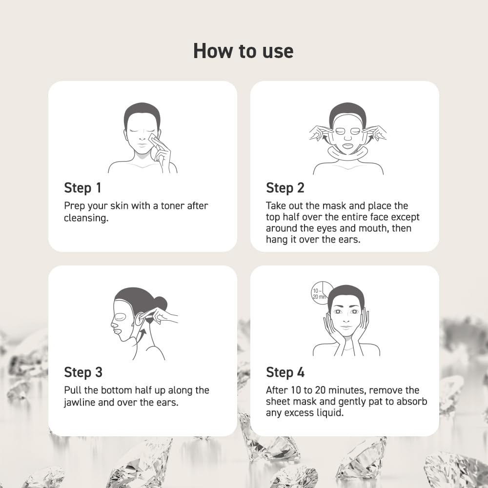 BRIGHTEN & REJUVENATE: Infused with Diamond powder, this mask adds vitality and imparts a luminous glow to your skin, enhancing its natural radiance. It also helps to diminish the appearance of dullness, uneven skin tone, and fine lines, leaving you with a revitalized complexion