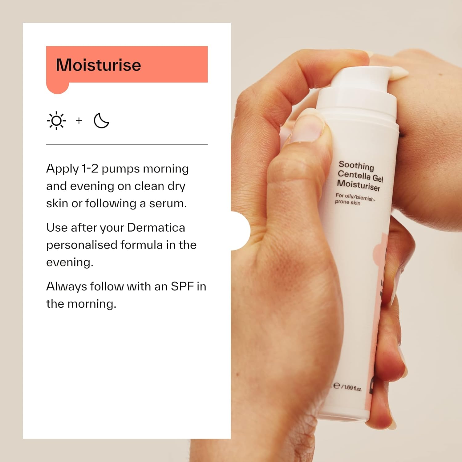 About this item The Soothing Centella Gel Moisturiser is a lightweight oil-free gel moisturiser that cools and hydrates oily and blemish-prone skin. Ceramides and centella asiatica help lock in moisture and strengthen the skin barrier. Hydrates and calms, without clogging your pores. Soothes irritated, blemish-prone areas. Protects your skinās natural barrier. This moisturiser is pH neutral, oil free and has no comedogenic ingredients. Apply 1-2 pumps morning and evening on clean dry skin or following a serum. Use before your Dermatica personalised formula in the evening. Always follow with an SPF in the morning. Item volume : 50.0 milliliters āŗ See more product details,The Soothing Centella Gel Moisturiser is a lightweight oil-free gel moisturiser that cools and hydrates oily and blemish-prone skin,Ceramides and centella asiatica help lock in moisture and strengthen the skin barrier,Hydrates and calms, without clogging your pores. Soothes irritated, blemish-prone areas. Protects your skinās natural barrier,This moisturiser is pH neutral, oil free and has no comedogenic ingredients,Apply 1-2 pumps morning and evening on clean dry skin or following a serum. Use before your Dermatica personalised formula in the evening. Always follow with an SPF in the morning,Item volume : 50.0 milliliters
