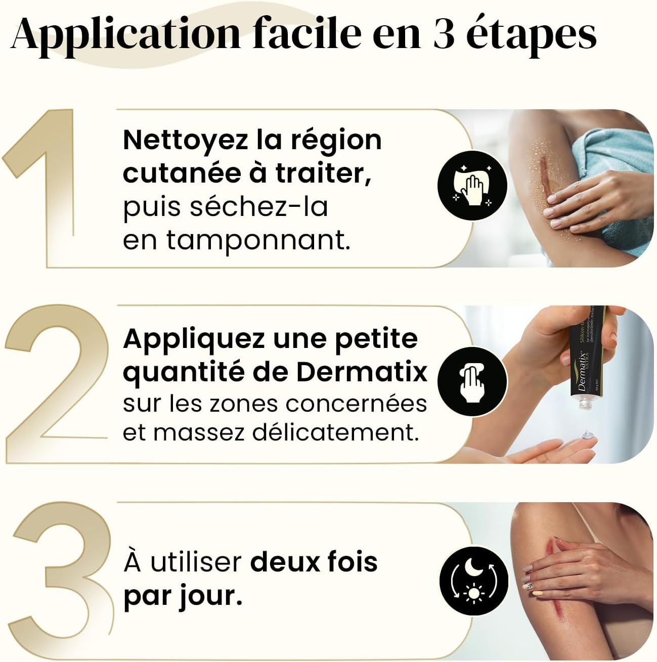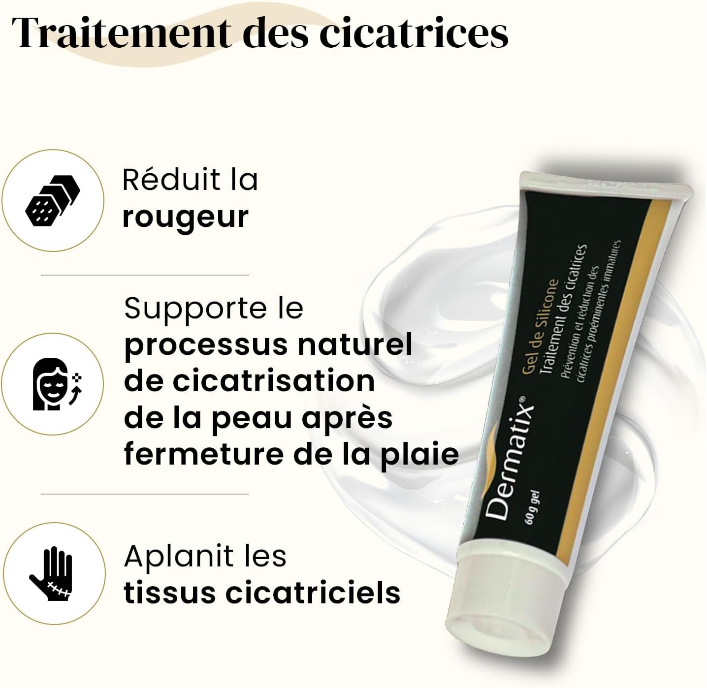 Product description Dermatix Gel Silicone 60g est un traitement à appliquer sur la surface cutanée cicatrisée, formant un mince film protecteur sur la peau. Il permet de maintenir une humidité équilibrée du tissu cicatrisé, afin de favoriser la reconstitution des surfaces cutanées atteintes, tout en diminuant les démangeaisons et les autres inconvénients des cicatrices, comme la sensation de tension de la peau et la douleur à la pression. Les cicatrices deviennent visiblement plus planes, douces et lisses. Les changements de couleur de la peau dus à la cicatrisation se font plus discrets. Texture gel transparent qui s'applique facilement sur toutes les surfaces et également sur les zones cutanées plus délicates. Sèche rapidement en formant un film invisible, ce qui permet un traitement des cicatrices du visage et du décolleté. Ingredients cyclopentasiloxane, phényl triméthicone, polyméthylsilsesquioxane, tétrahexyldécyl,Gel de silicone transparent pour améliorer l'aspect des cicatrices,A appliquer 2 fois par jour en couche mince sur la cicatrice. Pour cela, respectez les recommandations suivantes : 1. Nettoyez la région cutanée à traiter à l'eau additionnée de savon doux puis séchez-la en tamponnant doucement. 2. Appliquez avec précaution une très mince couche de gel sur la région cutanée voulue. 3. Laissez sécher 4 à 5 minutes à l'air libre. Si le gel n'est pas sec au bout de ce délai, vous en avez appliqué une quantité t,Tube de 60g