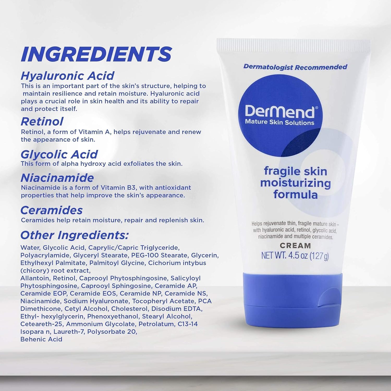 About this item Dermend Specialized Fragile Skin Moisturizing Cream: Formula To Restore Rejuvenate Mature Skin 4 5 Oz Tube Mature Skin Care: Strengthen And Protect Thinning Skin That Tears Easily And Looks Crepey Or Wrinkly Look More Youthful: Smooth Soften And Tighten Dry Skin That Sagging And Lost Its Elasticity Dermatologist Recommended: Moisturizes Repairs And Replenishes Thinning Skin On The Face And Body Nourishing Formula: Ceramides And Other Enriching Ingredients Improve Skin Health And Appearance › See more product details,Dermend Specialized Fragile Skin Moisturizing Cream: Formula To Restore Rejuvenate Mature Skin 4 5 Oz Tube,Mature Skin Care: Strengthen And Protect Thinning Skin That Tears Easily And Looks Crepey Or Wrinkly,Look More Youthful: Smooth Soften And Tighten Dry Skin That Sagging And Lost Its Elasticity,Dermatologist Recommended: Moisturizes Repairs And Replenishes Thinning Skin On The Face And Body,Nourishing Formula: Ceramides And Other Enriching Ingredients Improve Skin Health And Appearance